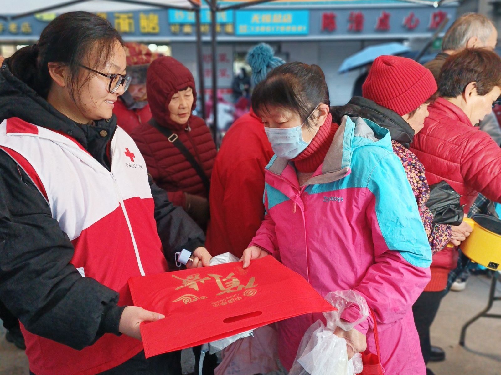 红十字志愿者一大早就来到农贸市场忙活起来,布置活动场地。早上7点,精心熬制几个小时的腊八粥,热气腾腾,混合着醇厚的米香、枣香、豆香,送到了活动派发点。天空中下起了绵绵细雨,群众们的热情丝毫不减,前来参加活动的居民络绎不绝,在红十字志愿者的引导下有序排队。居民们手里捧着香气扑鼻的腊八粥,脸上幸福洋溢,口中连连称赞。