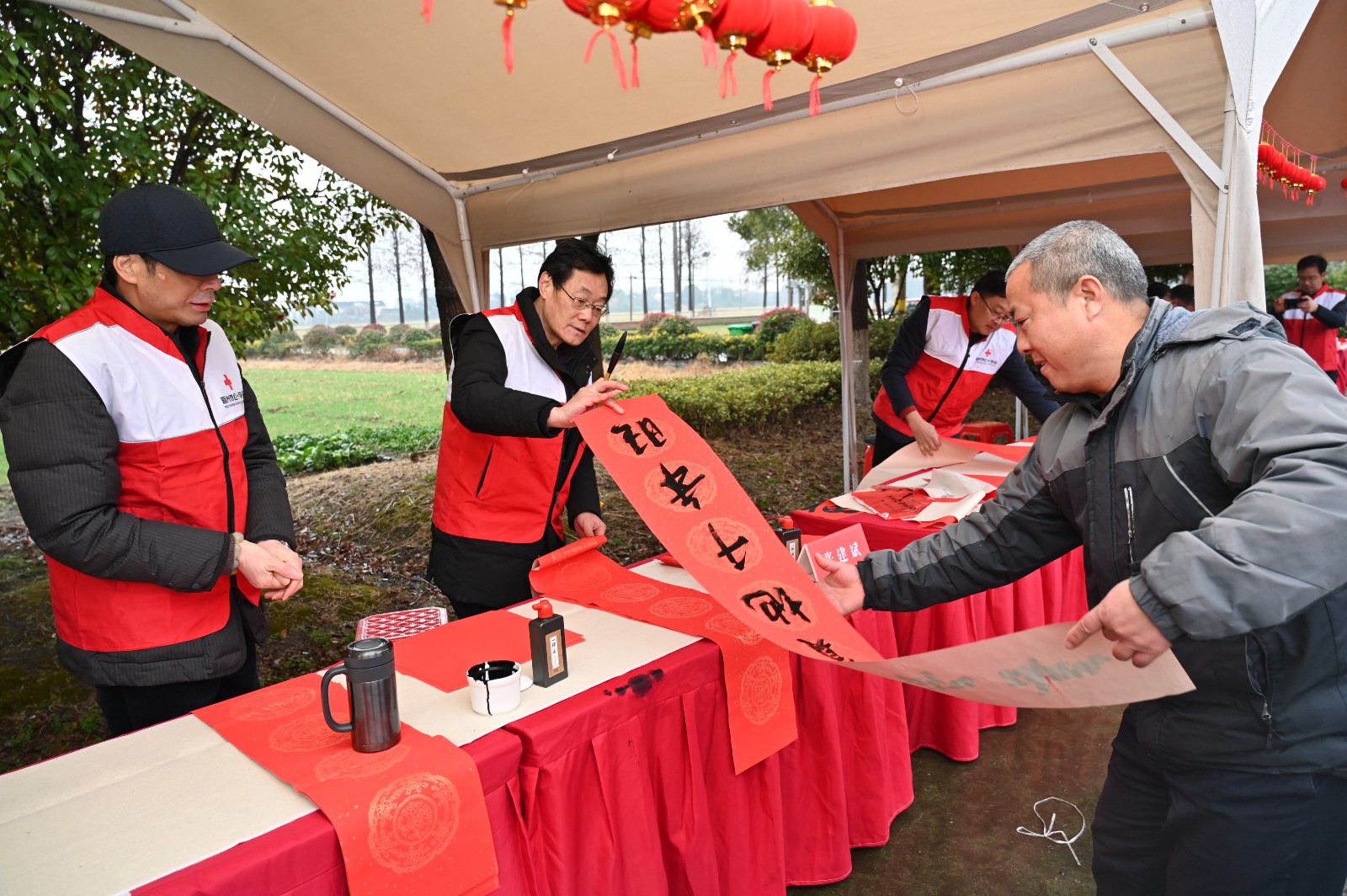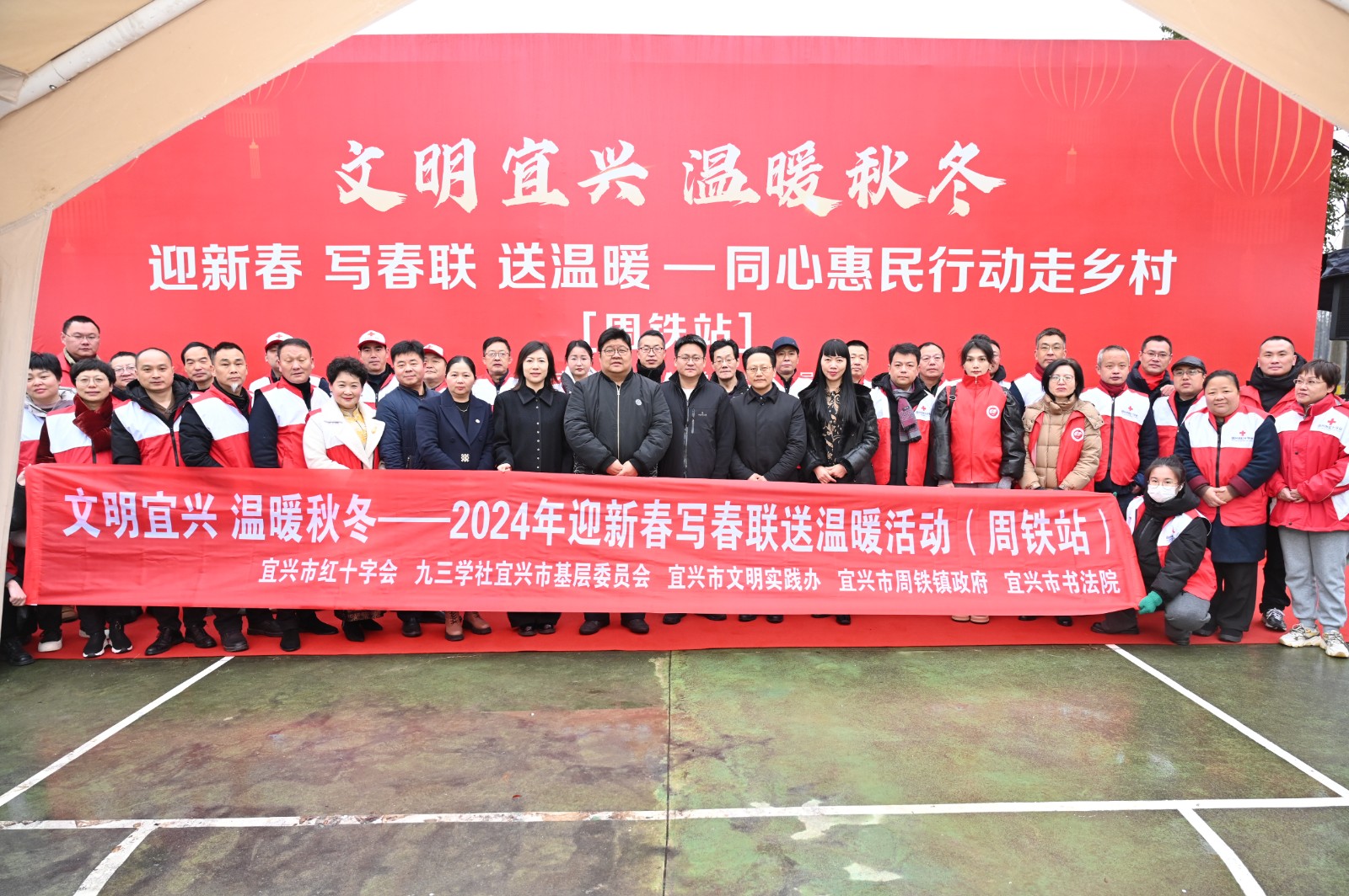 1月20日,“文明宜兴 温暖秋冬——同心惠民行动走乡村”活动来到周铁镇东湖村,宜兴市红十字会、九三学社宜兴市基层委员会、宜兴市文明实践办、周铁镇政府、宜兴市书法院、宜小红艺术团共同为居民朋友们写福字、送春联,传递新春的祝福。