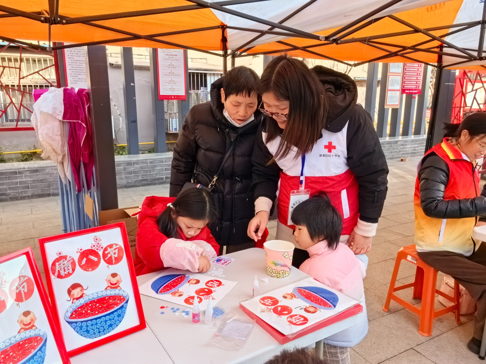 广场上,一个个摊位都热闹非凡。社区红十字工作人员为孩子们带来了龙年趣味字DIY手工纽扣画绘画活动,娃娃们发挥想象,用大小不同、颜色各异的纽扣拼一拼、贴一贴。一幅幅精美的纽扣贴画呈现出来,孩子们捧着自己的作品一个个喜笑颜开。