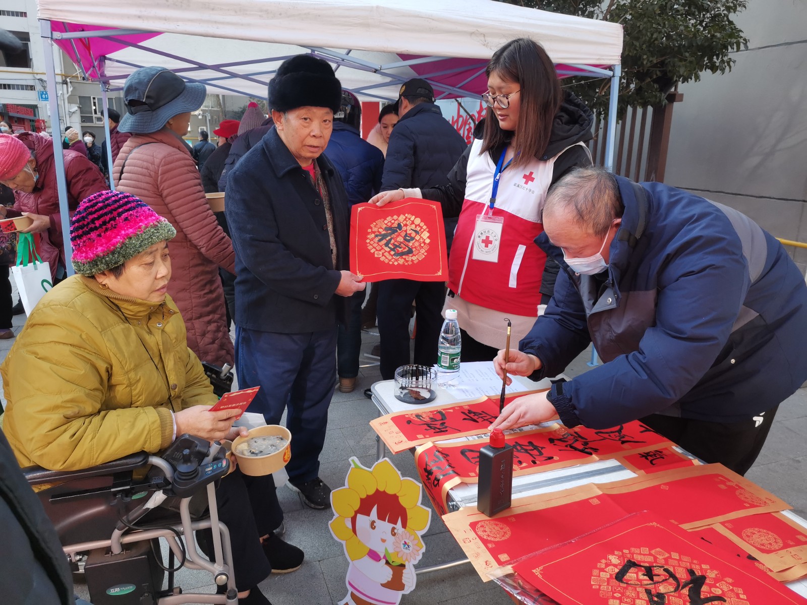 无联不成春,有联春更浓。写春联的摊位上更是排起了长队,一名擅长书法的红十字志愿者挥毫泼墨,一行行俊逸的书法,一句句真诚的祝福,寄托了居民辞旧迎新、接福纳祥的美好愿望。现场的居民一个个排着队等着拿大红的福字和春联,整个活动洋溢着新年的喜庆气氛,荡漾着墨汁的扑鼻芳香。