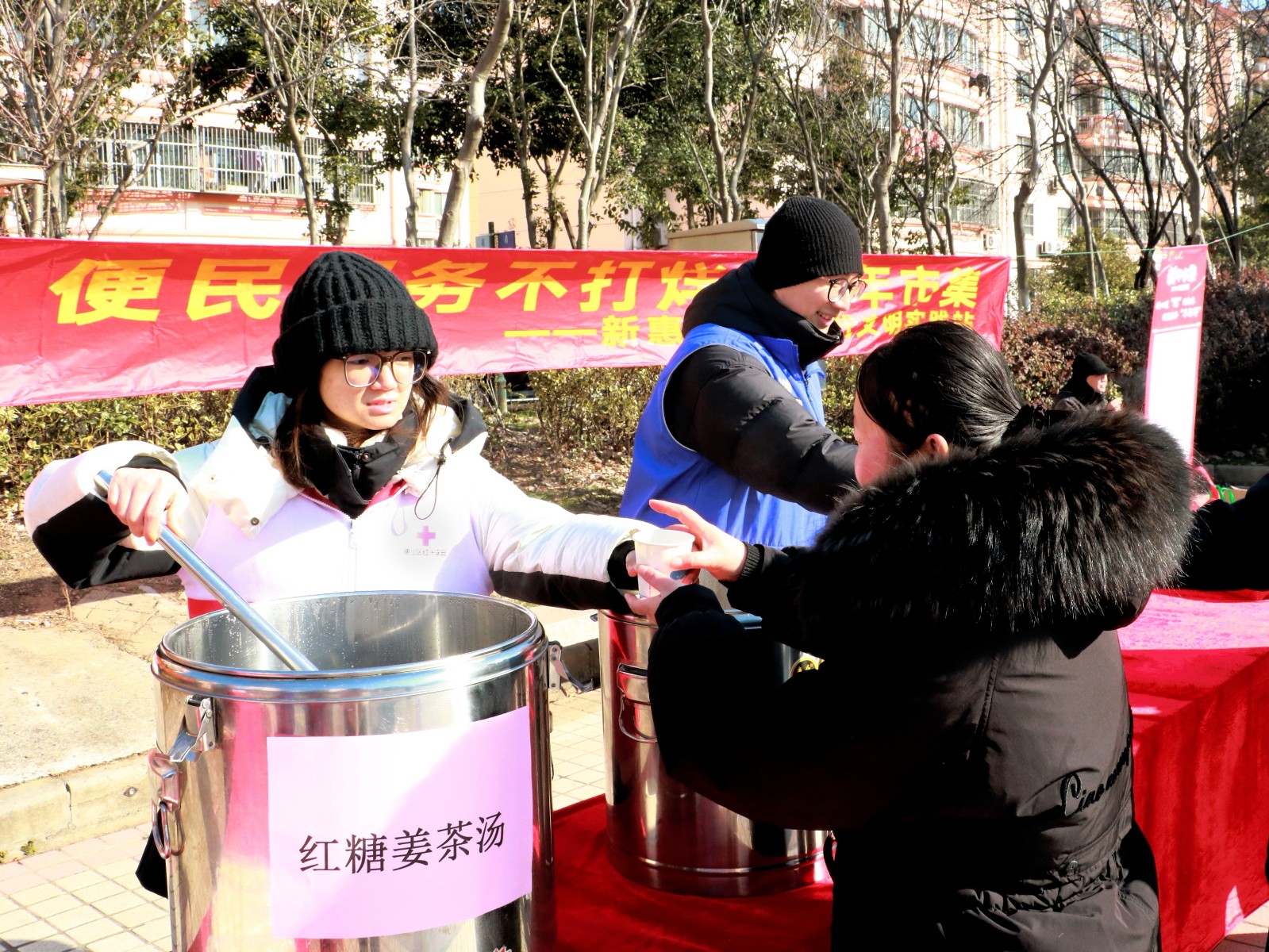 在中国人的习俗中,年味往往是从“赶集”中开始的,更是代表一种热闹、丰富、有趣的生活方式。“我喜欢这幅春联‘喜居宝地千年旺,福照家门万事兴’,就给我拿这幅!”“老伯伯,去志愿者那里拿号排队,70岁以上的老年人可以免费理发。”“阿姨,天冷要不要喝杯姜汤暖暖身子”爱心理发小屋内、便民服务摊位前、民俗游戏活动区,到处都是居民们的欢声笑语,红十字会志愿者们准备的热腾腾的养生汤、姜汤更是为新年市集增添了一丝“烟火气”。“没想到小区里也有这种市集可以逛,春联一摆,年味儿瞬间就满了,热热闹闹的,才像要过年的样子。”周阿姨领着对联、喝着姜汤高兴地说道。