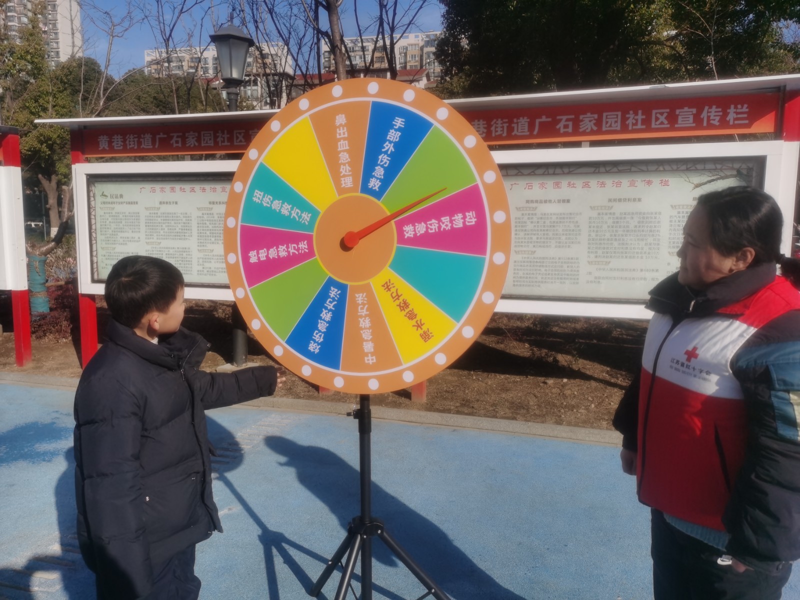 活动将知识科普与游戏竞赛相结合,“手部外伤急救?溺水急救方法?触电急救方法?”在大转盘知识问答环节,通过随机抽题、现场答题的形式,让居民学习掌握基本应急技能,提高应急救护能力。