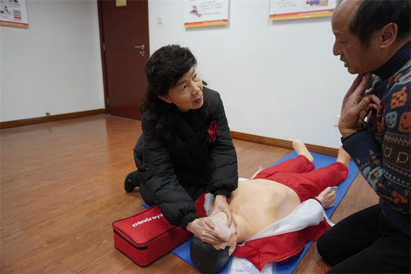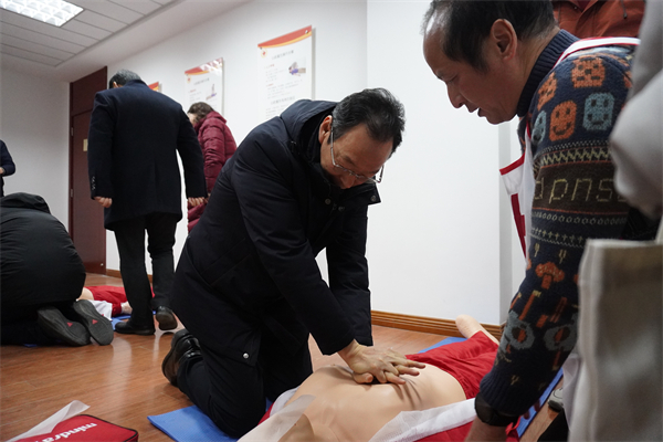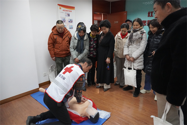 张湘玲一行参观了备灾救灾中心物资储备仓库、应急救援物资装备库、养老照护培训教室、志愿者活动室,听取了市红十字会工作情况的介绍,还参加了急救技能培训,学习了心肺复苏术、AED(心脏体外除颤仪)使用方法、气道异物阻塞“海姆立克”急救法,并进行实践操作。