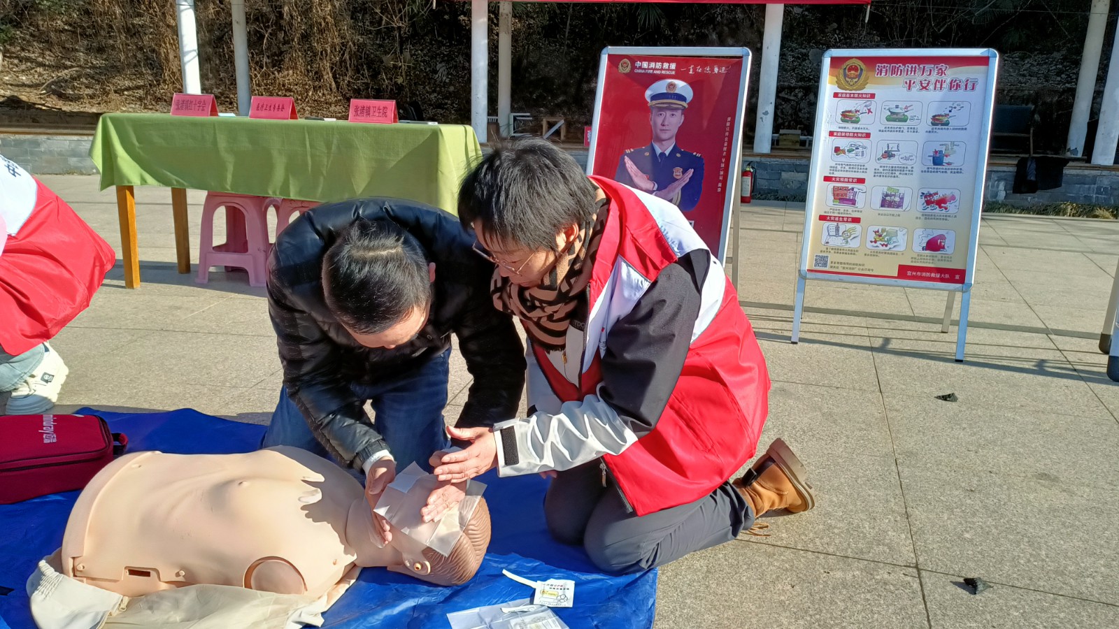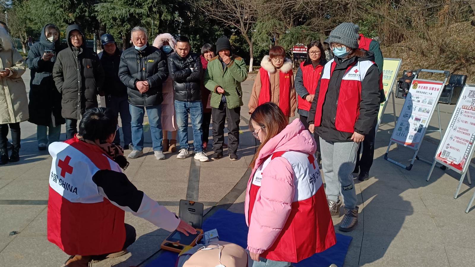 1月23日上午,张渚镇红十字会走进张渚镇桃溪社区开展红十字应急救护培训活动。上午8点,牛犊山公园广场,人头撰动,红十字志愿者们就开始忙碌起来,为活动作准备。