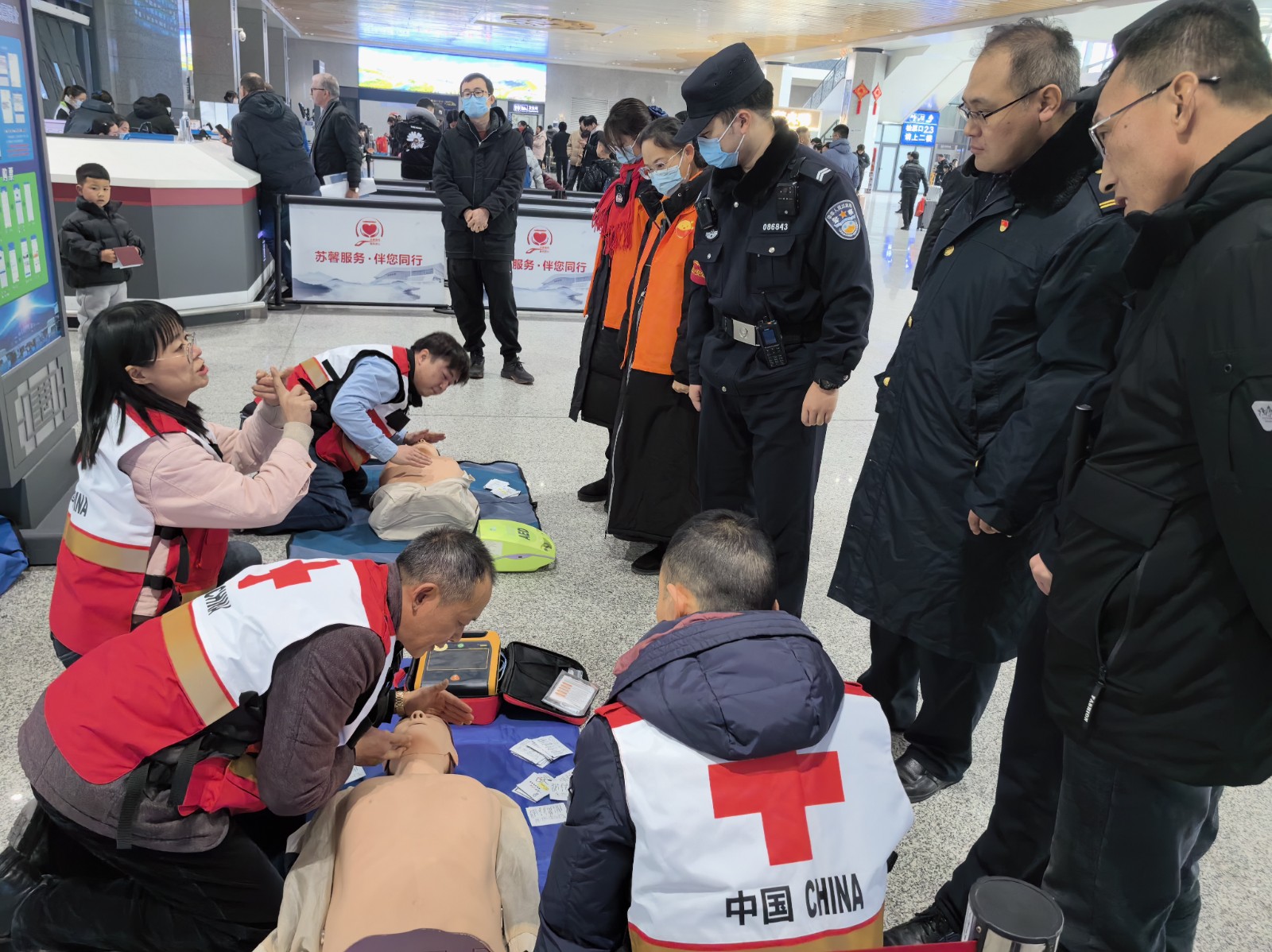 巡检当天,正值春运启动,张家港高铁站人头攒动。救援队志愿者在巡检结束后,主动为高铁站的工作人员和旅客开展应急救护技能培训。“看到有人倒地,先评估环境确保自身安全,再轻拍患者双肩,大声呼喊判断意识……”在候车厅里,救援队志愿者利用模拟人向工作人员和过往乘客演示心肺复苏步骤、AED使用方法,现场学习氛围浓厚,不少旅客纷纷上前操作练习,大家纷纷表示,这是一堂实实在在的“救命课”。