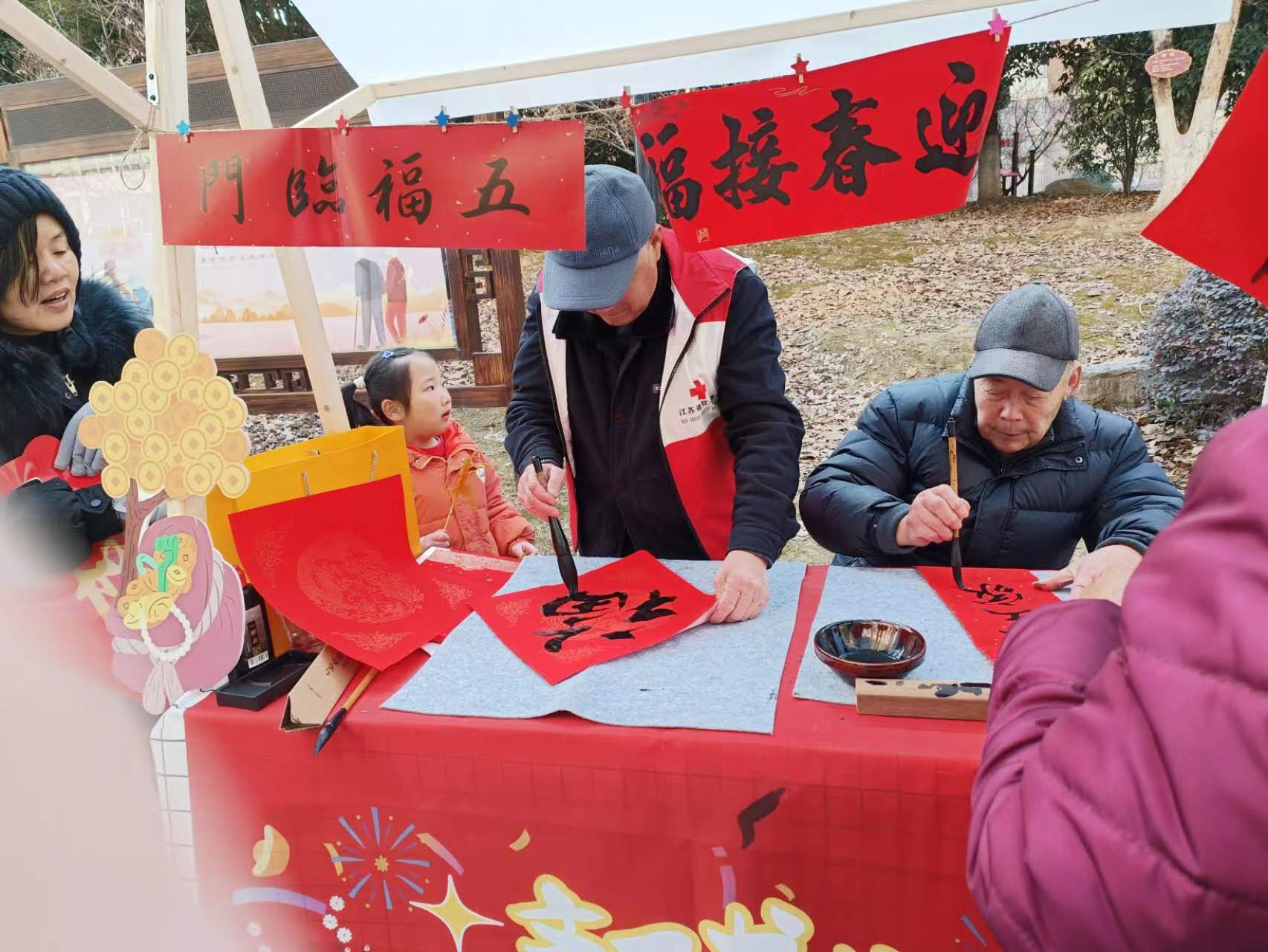 这里有书香。红纸鲜艳,翰墨飘香。毛岸新苑社区红十字会邀请了辖区书法爱好志愿者。活动现场,墨香飘溢,气氛热烈,群众脸上笑意浓浓。红红喜庆的春联,承载着满满的祝福和吉祥,散发着清新的墨香,现场书写的一幅幅充满吉祥祝福的春联和一个个福字,满载着大家对新一年的美好祝福,受到了现场居民们的热烈欢迎,整个现场充满了喜气洋洋的年味,感受中华传统文化的博大精深。