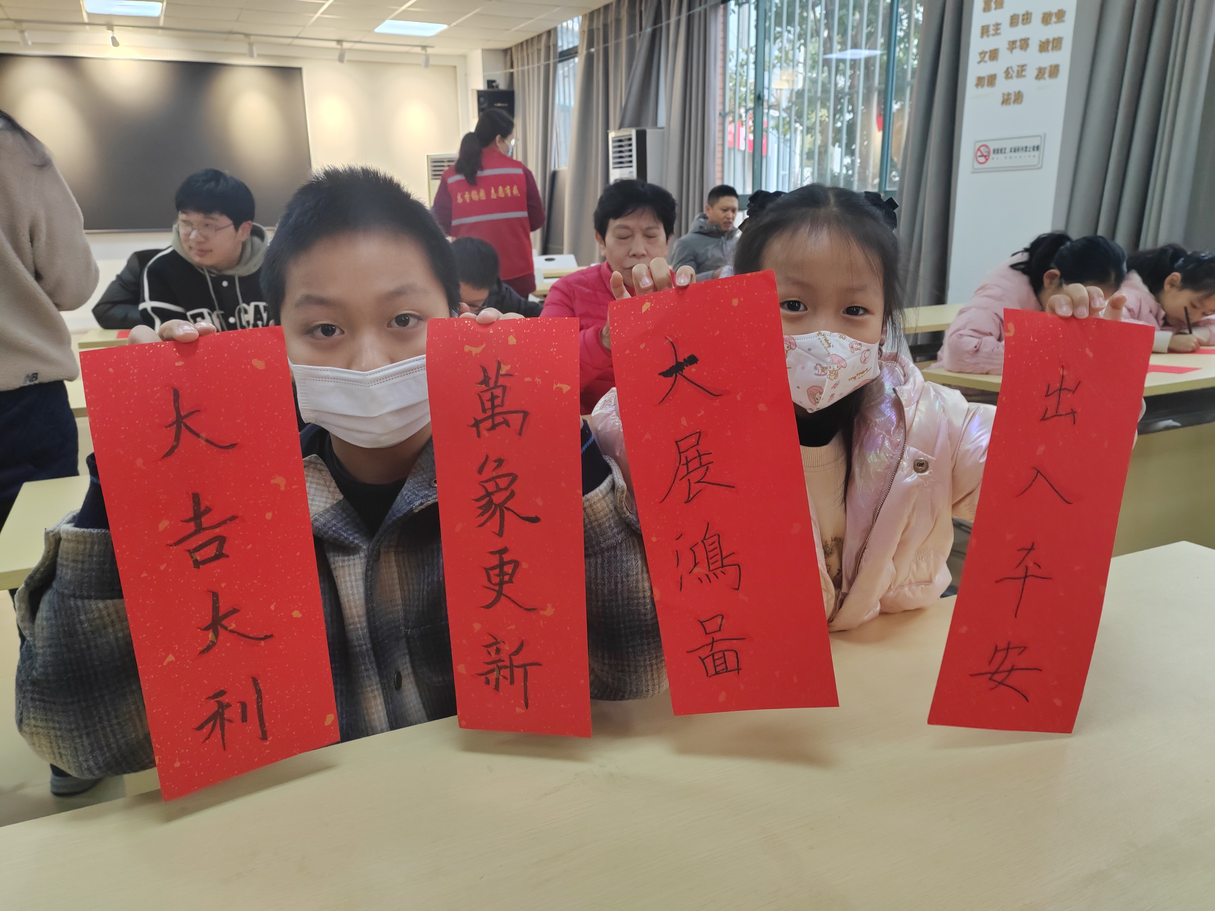 在活动现场,青年馆员钱老师为社区孩子们带去“典籍里的中国年”主题巡讲,介绍展示典籍中有关守岁、吃年夜饭、贴春联、祭灶等年俗的历史故事、礼制民俗,老师用生动的语言和丰富的故事,引领孩子们走进了中国传统经典的世界,让他们感受到了中华文化的深厚底蕴和博大精深;随后,通过“我家的年味故事”分享、龙年春联手写体验等现场互动,与孩子们一起喜迎书香中国年,感受中华优秀传统文化的魅力。最后,社区红十字工作人员还为孩子们普及了寒假安全知识,让孩子们假期快乐不忘安全,安全时刻记心间。