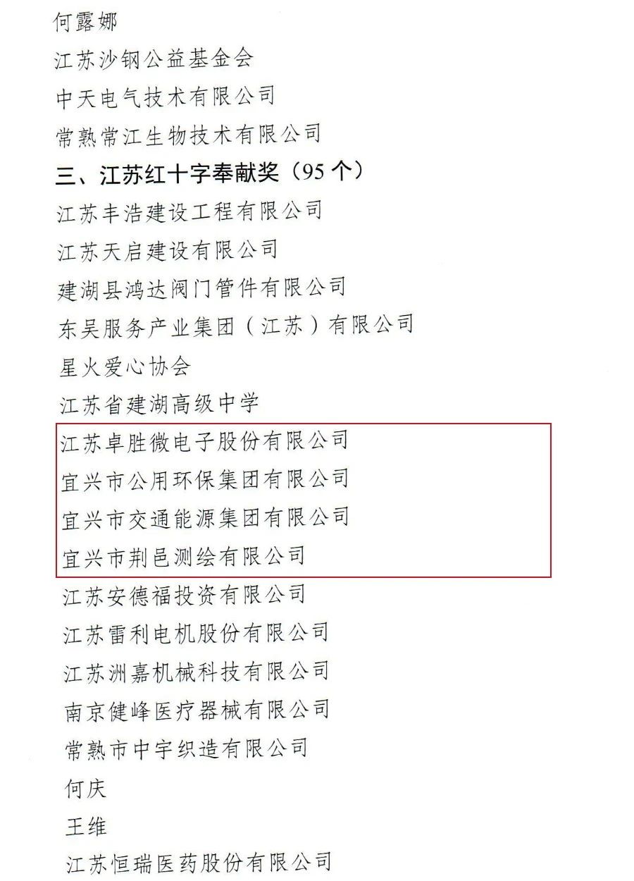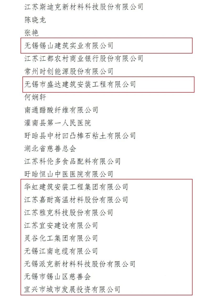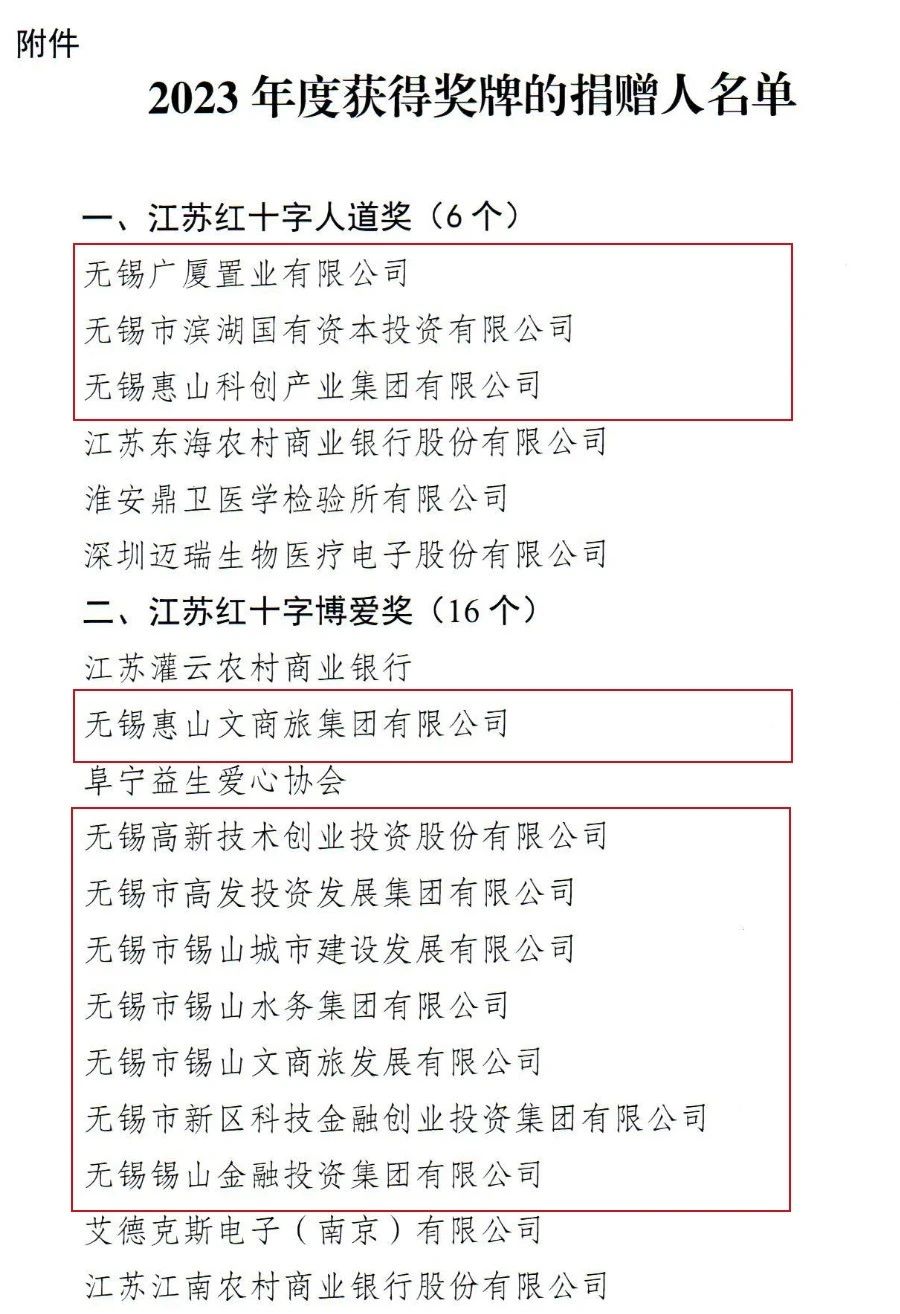 2023年,我省广大爱心企业、单位和个人慷慨解囊、捐款捐物,用实际行动践行了社会责任,充分体现了“人道、博爱、奉献”的红十字精神,生动诠释了守望相助的人道主义情怀。日前,在“为江苏红十字事业作出突出贡献捐赠人奖”评选活动中,无锡共有31家企业和单位获表彰,占全省表彰总数的33。 其中无锡广厦置业有限公司、无锡市滨湖国有资本投资有限公司、无锡惠山科创产业集团有限公司等3家单位获“江苏红十字人道奖”; 无锡惠山文商旅集团有限公司、无锡市锡山水务集团有限公司、无锡市锡山城市建设发展有限公司、无锡锡山金融投资集团有限公司、无锡市锡山文商旅发展有限公司、无锡市高发投资发展集团有限公司、无锡市新区科技金融创业投资集团有限公司、无锡高新技术创业投资股份有限公司等8家单位获“江苏红十字博爱奖”; 江苏卓胜微电子股份有限公司、宜兴市交通能源集团有限公司、宜兴市荆邑测绘有限公司、宜兴市公用环保集团有限公司、无锡锡山建筑实业有限公司、无锡市盛达建筑安装工程有限公司、宜兴市国有资本投资控股集团有限公司、宜兴市陶都科技新城发展有限公司、宜兴市大数据发展有限公司、宜兴市城市发展投资有限公司、江苏宜安建设有限公司、无锡江南电缆有限公司、江苏雅克科技股份有限公司、灵谷化工集团有限公司、江苏嘉耐高温材料股份有限公司、华虹建筑安装工程集团有限公司、无锡派克新材料科技股份有限公司、中国初级卫生保健基金会、海澜之家集团股份有限公司、无锡市锡山区慈善会等20家单位获“江苏红十字奉献奖”。