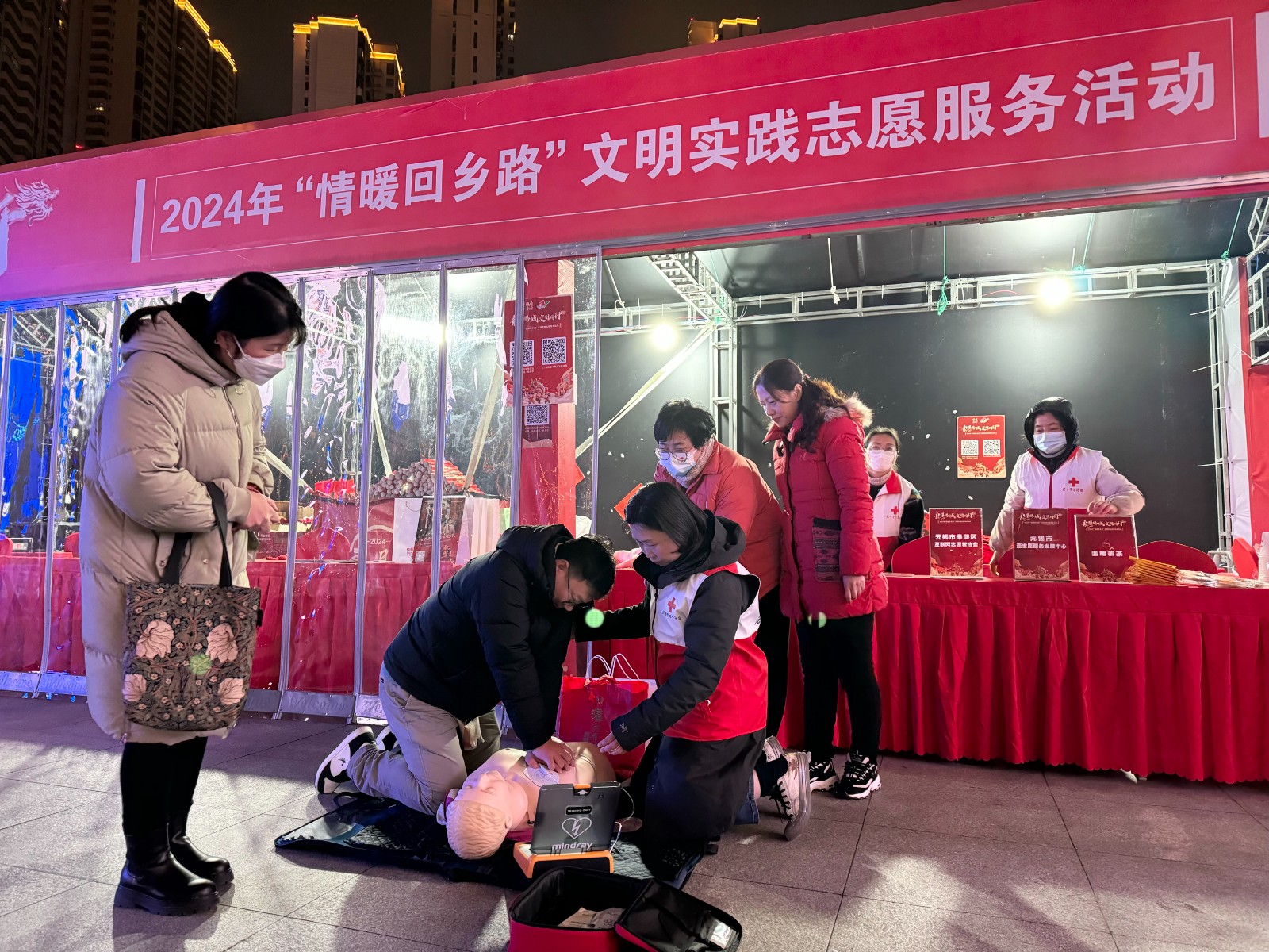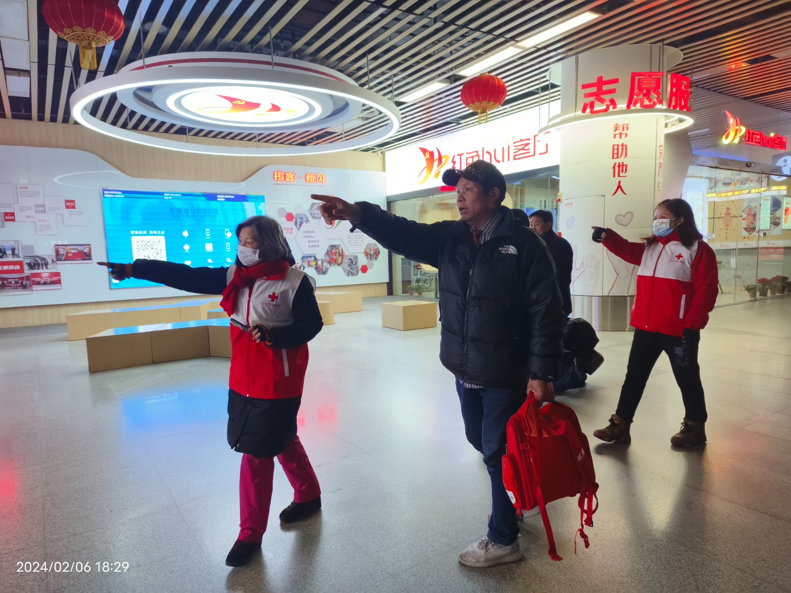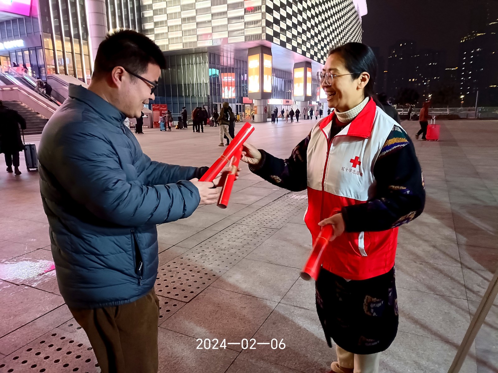 2024年春节前夕,市红十字网络志愿队的志愿者们在火车站组织开展“情暖回乡路”春运期间关爱外来务工人员志愿服务活动,为有需要的过往旅客送春联福袋、姜茶热水、救护培训、提供咨询服务。