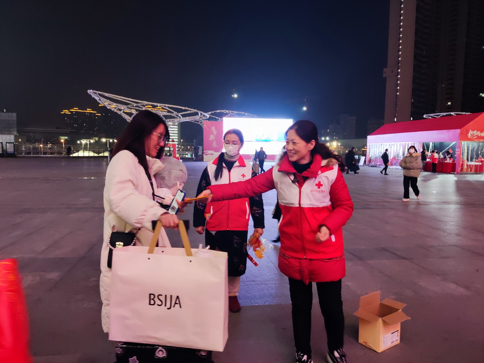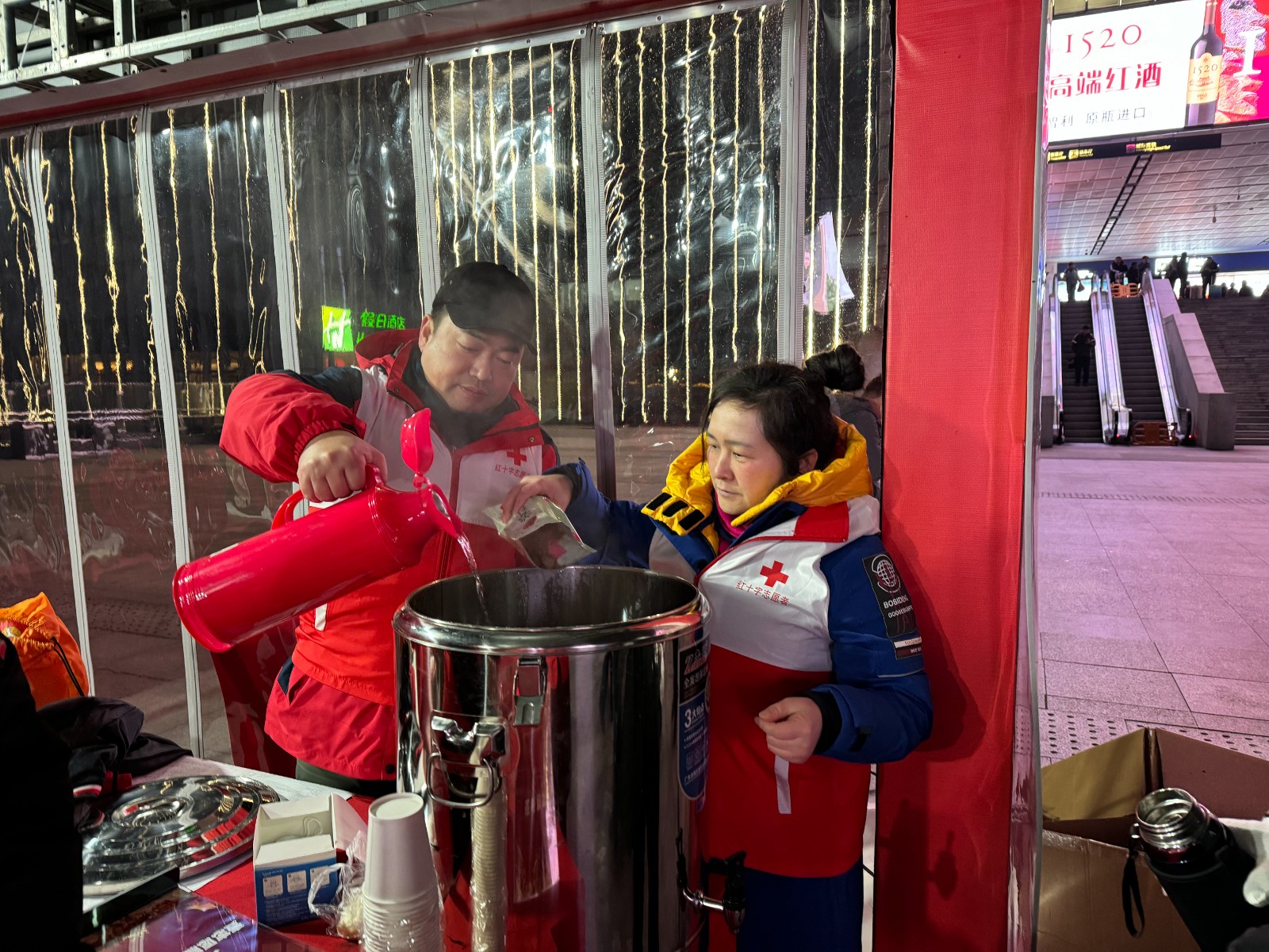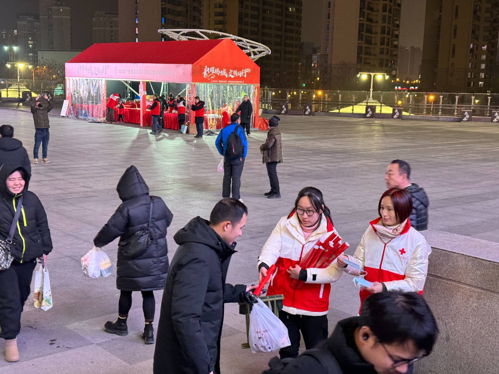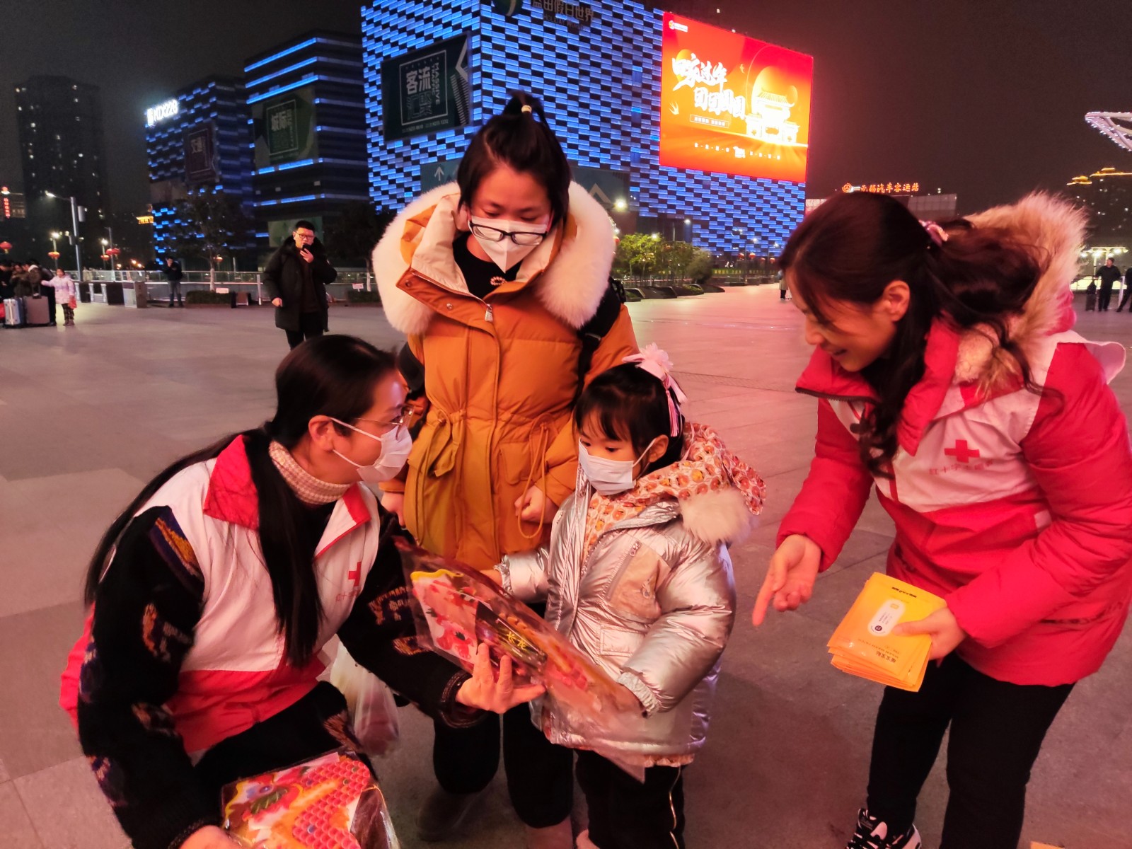 2024年春节前夕,市红十字网络志愿队的志愿者们在火车站组织开展“情暖回乡路”春运期间关爱外来务工人员志愿服务活动,为有需要的过往旅客送春联福袋、姜茶热水、救护培训、提供咨询服务。