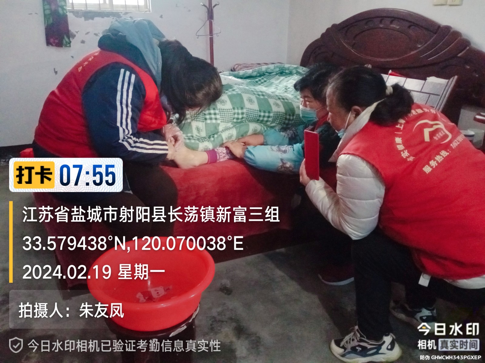 龙年复工第一天,射阳县红十字会金色华年志愿服务队“兵分两路”,志愿者金萍、陈海娥等7人来到吴银坤老人家,田姝斌、仇云兰等6人来到许友巧老人家开展志愿服务。