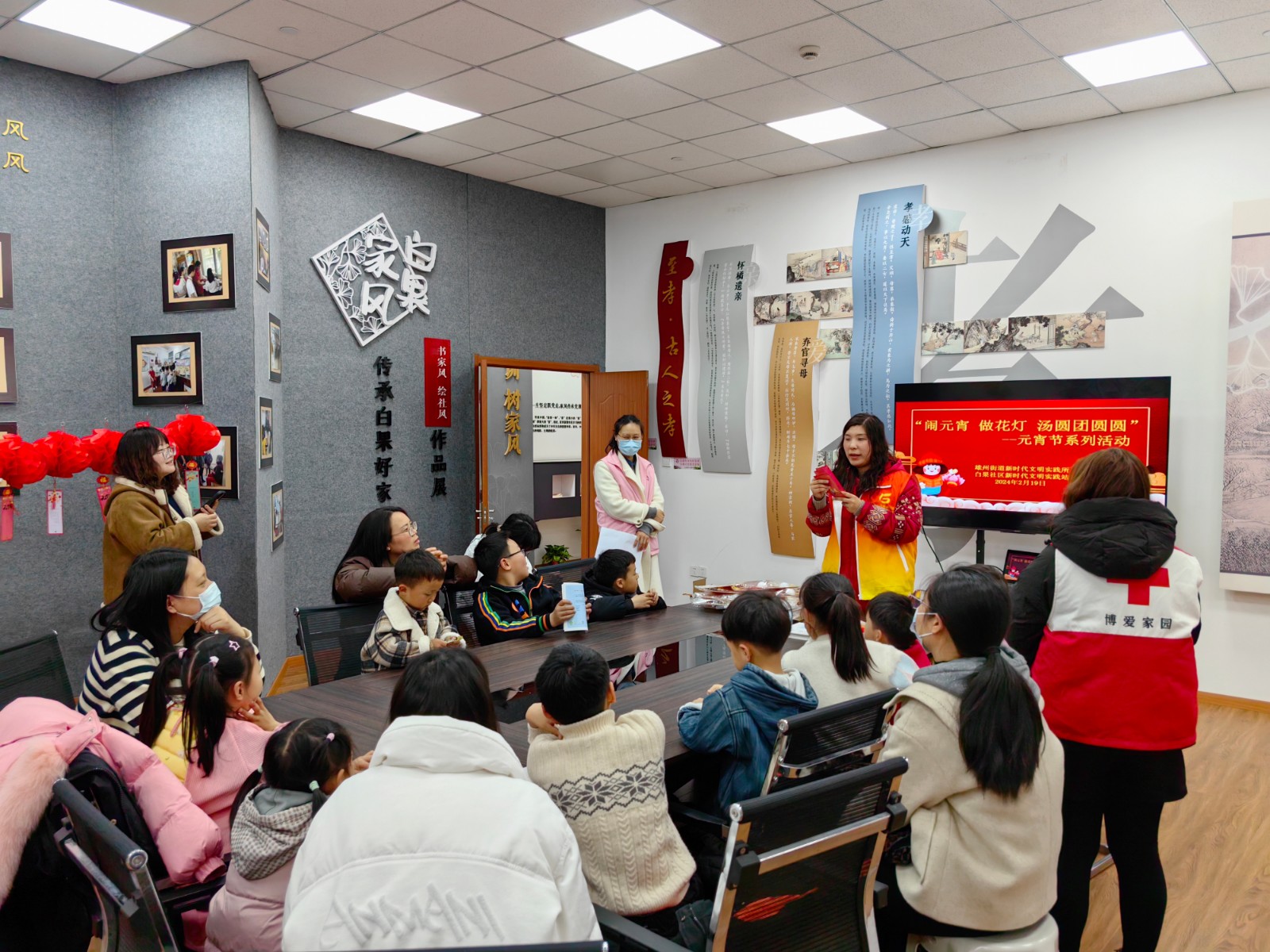 2月19日下午,白果社区博爱家园志愿服务队组织开展“闹元宵,做花灯,煮汤圆”元宵节活动,辖区内15组亲子家庭参加。