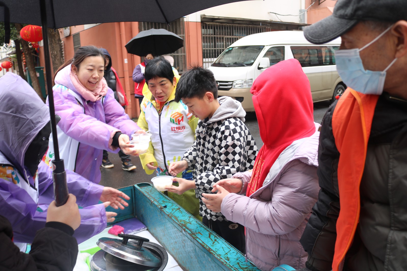 2月20日上午,送元宵队伍从工南47幢幸福里居家养老普康站点出发,沿着辖区内主干道缓缓前行。队伍前面是党员代表组成的锣鼓队,他们用力地敲打着锣鼓,声音洪亮,节奏明快,吸引了众多居民的目光。紧随其后的是各类志愿者们,他们手提着热气腾腾的汤圆,笑容满面地向路过的居民分发。