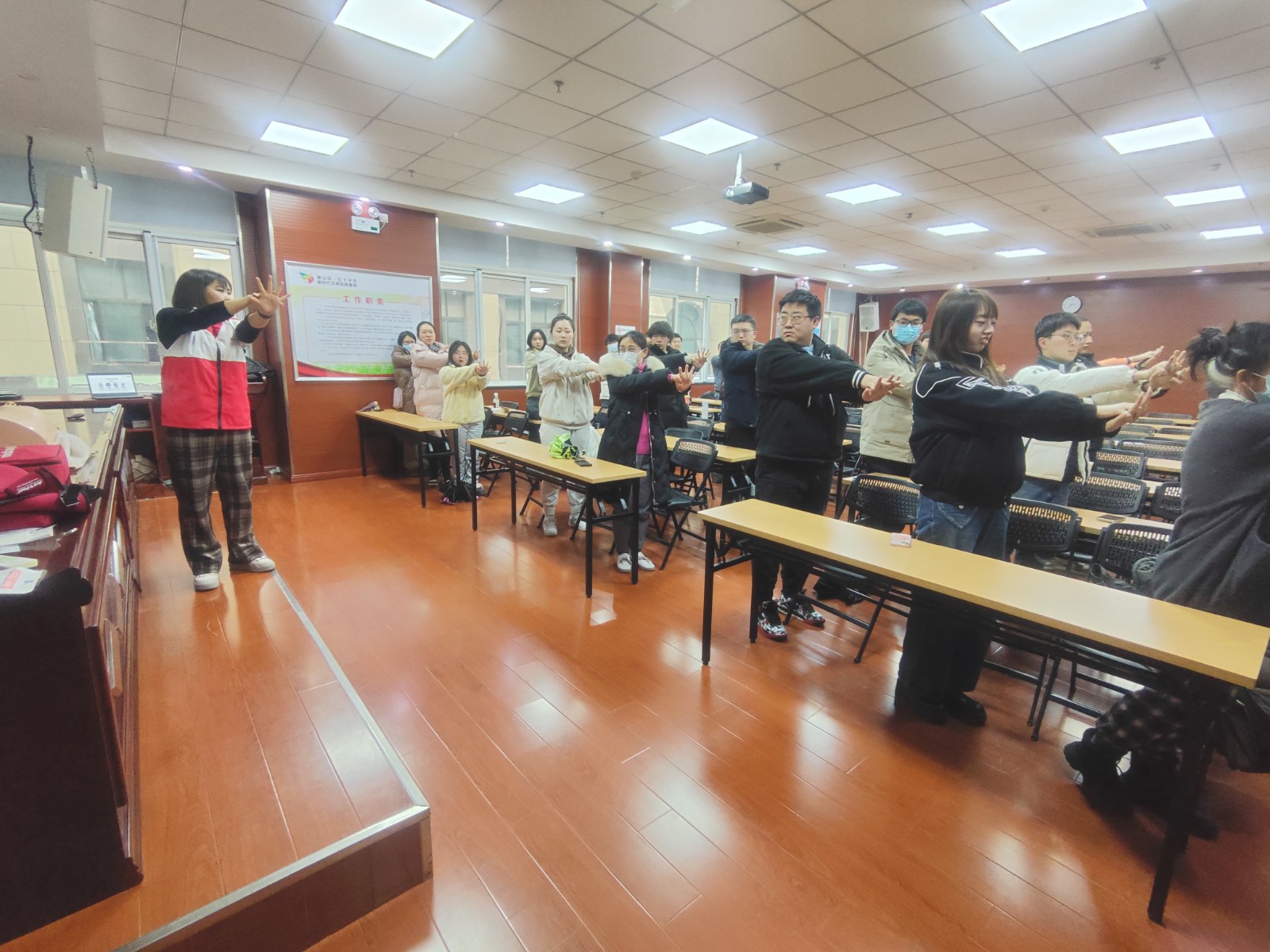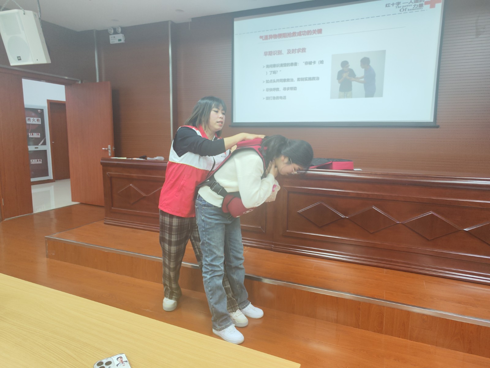 本次培训由区红十字会骨干师资后丽娟老师主持。后老师通过理论讲解、视频教学、示范操作等环节生动形象、通俗易懂地为学员们介绍了现场救护、心肺复苏、AED的使用、气道梗阻的现场急救和创伤救护等基本知识,并现场示范了急救操作的标准操作流程,手把手为学员们进行技能指导,学员们听得认真,与老师积极互动,现场几次鼓起了热烈的掌声,取得良好培训效果。