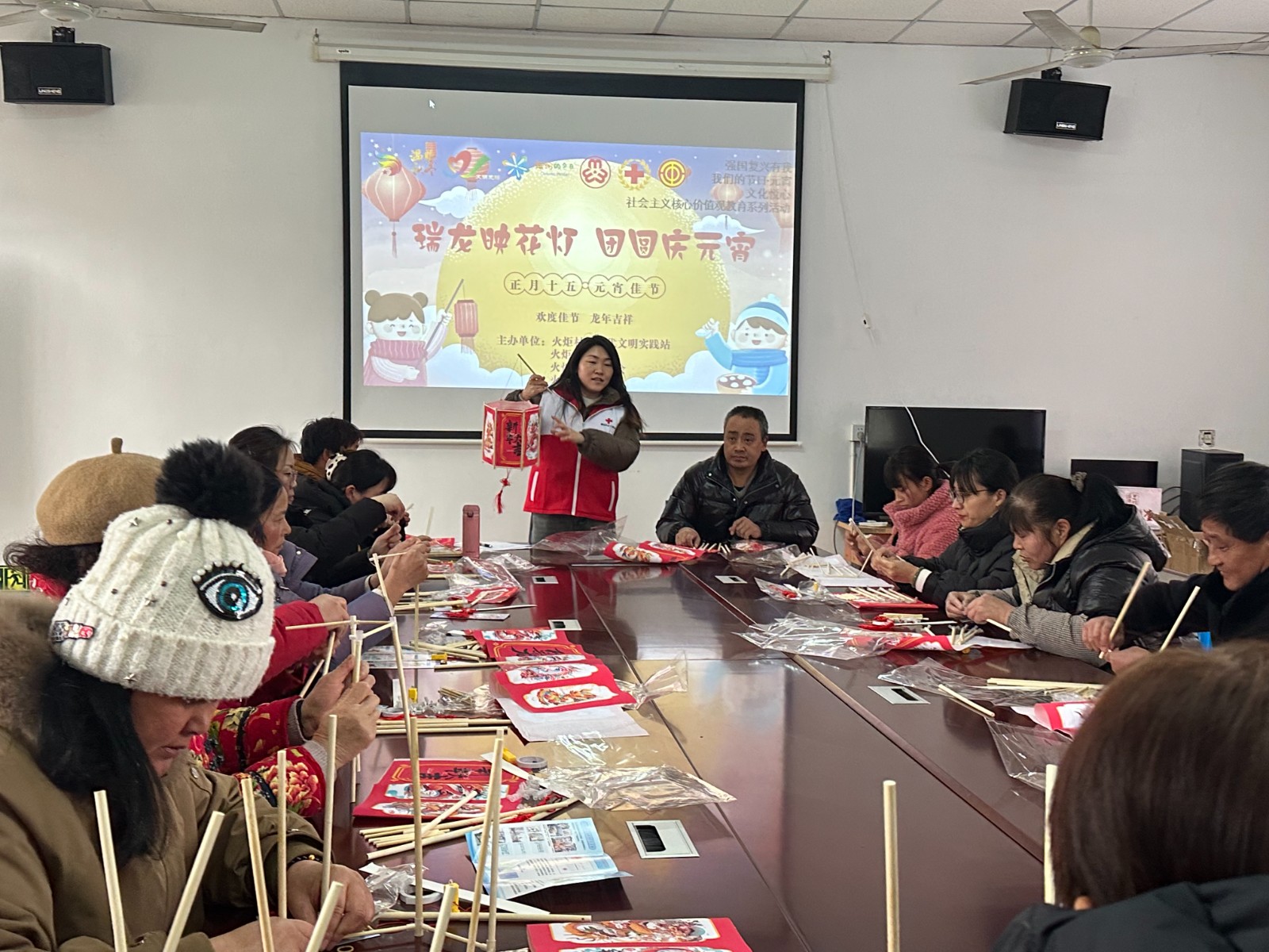 活动开始,红十字志愿者详细介绍了元宵节的来历和花灯的传说。在悠扬的音乐声中,村民们不仅感受到了中华民族的传统美德,还对元宵节的历史文化有了更深刻的理解。紧接着,村民们一起动手制作六角手工灯笼。虽然制作过程看似复杂,但在志愿者的耐心指导下,共同努力,最终都成功完成了自己的作品。村民们手中的灯笼五彩斑斓,形状各异,仿佛将整个元宵节的喜庆氛围都凝聚在了其中。
