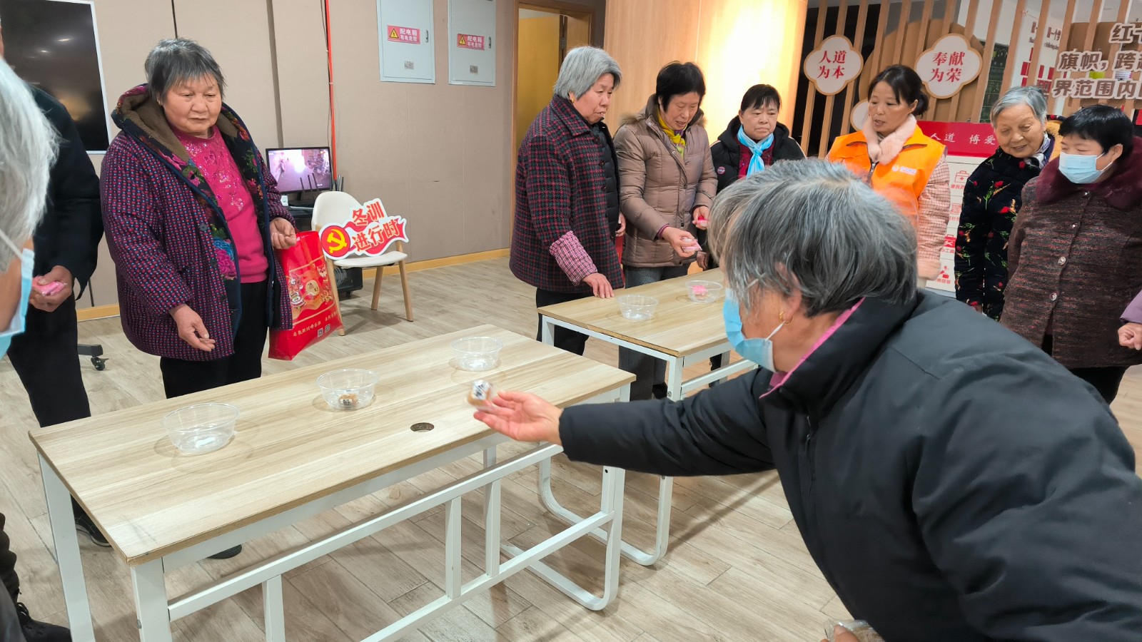 同步开启的活动内容还有“下”元宵、“夹”元宵、“抖”元宵等多项趣味游戏。“下”元宵即丢沙包,“夹”元宵则是用筷子夹乒乓,最后的“抖”元宵,参赛的居民们要将装着乒乓球的盒子绑在腰上,随着志愿者哨声一响,大家纷纷铆着劲抖动了起来,现场的加油声与欢笑声也此起彼伏地响了起来。