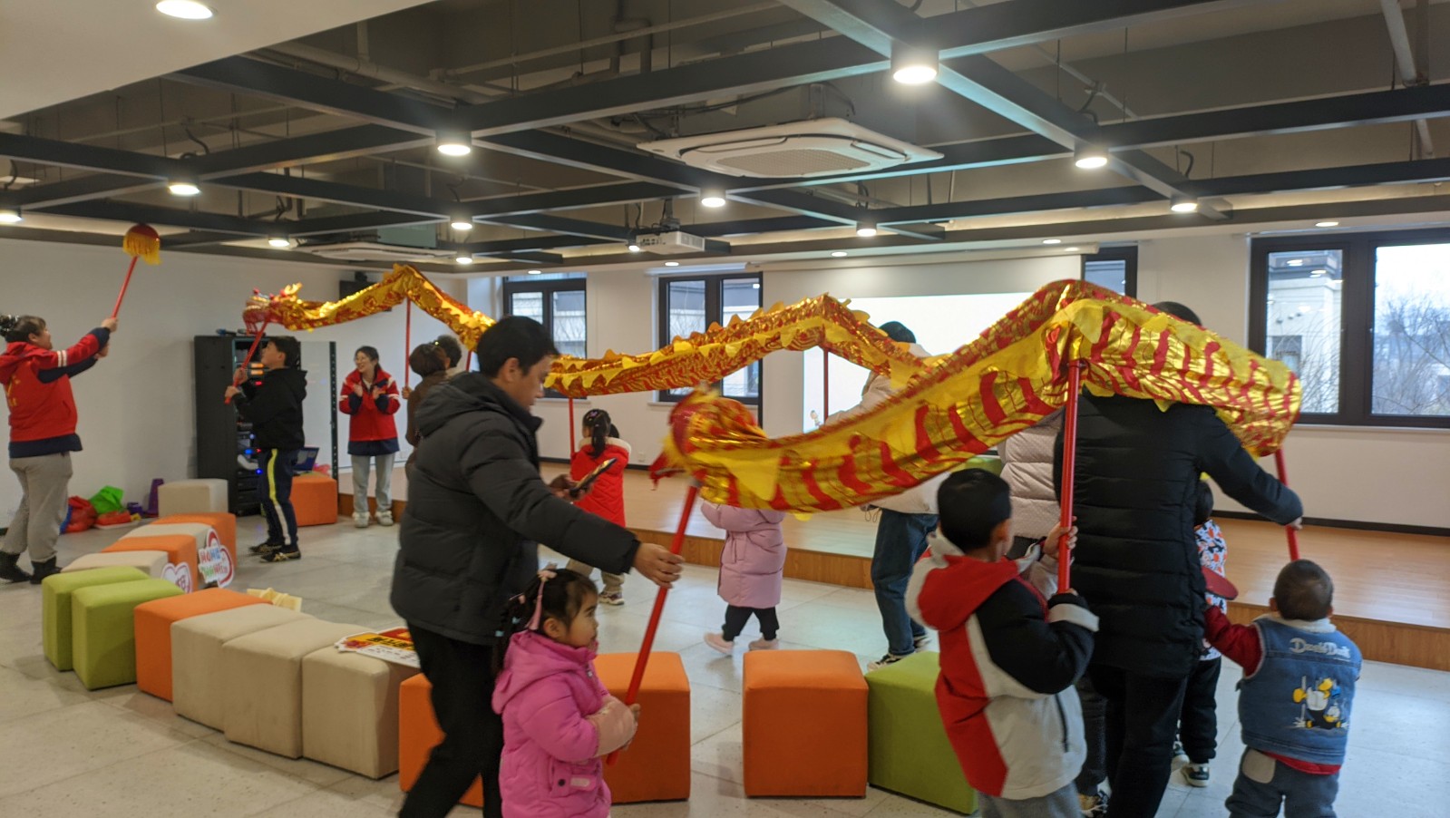 伴随着咚咚锵的锣鼓声,只见金龙势如虹,追逐着宝珠,孩子们在老师的带领下开始了舞龙体验。他们手握色彩斑斓的龙身,在激昂的鼓点和节奏中,一左一右,振臂摆动。大家时而让龙身翻腾起舞,时而让龙头高昂向天,时而嬉戏,时而争抢,时而跳跃,仿佛一条真正的小龙在空中欢快地盘旋,为节日增添了无尽的童真与活力。