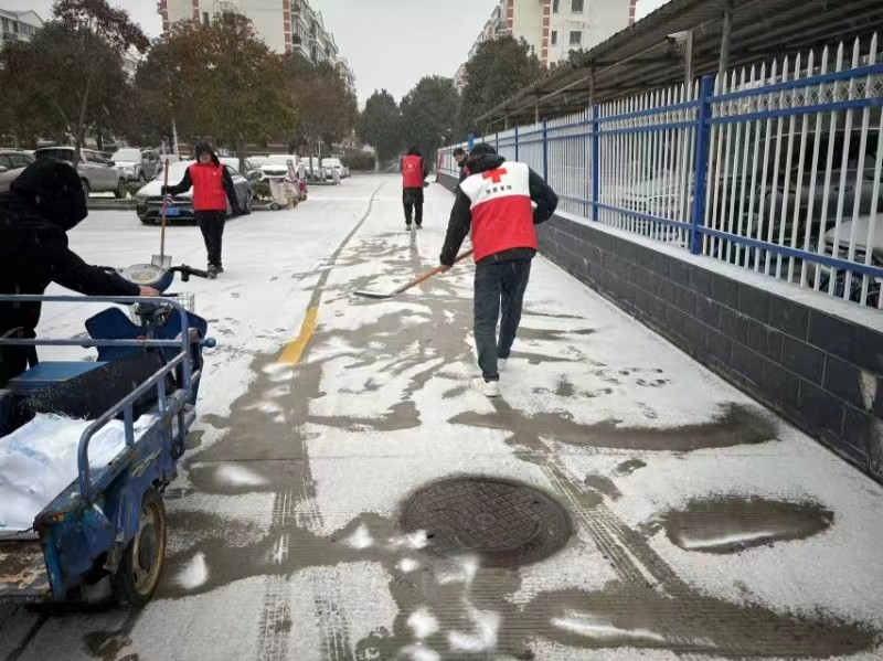 新年初始的一场大雪天给居民的出行和生活带来了极大的不便,为了保障广大居民的出行安全,金湖县红十字各博爱家园以雪为令,积极发动组织红十字志愿者开展扫雪行动,方便社居民出行。虽然雪花仍在飞舞,天气非常寒冷,但是志愿者们干劲十足,分工合作,拿着铁、扫帚努力地清扫着路面的积雪和开展路面撒盐行动。通过志愿者们的行动,社区的道路通畅了,积雪成冰的安全隐患消除了,保障了群众的出行安全。