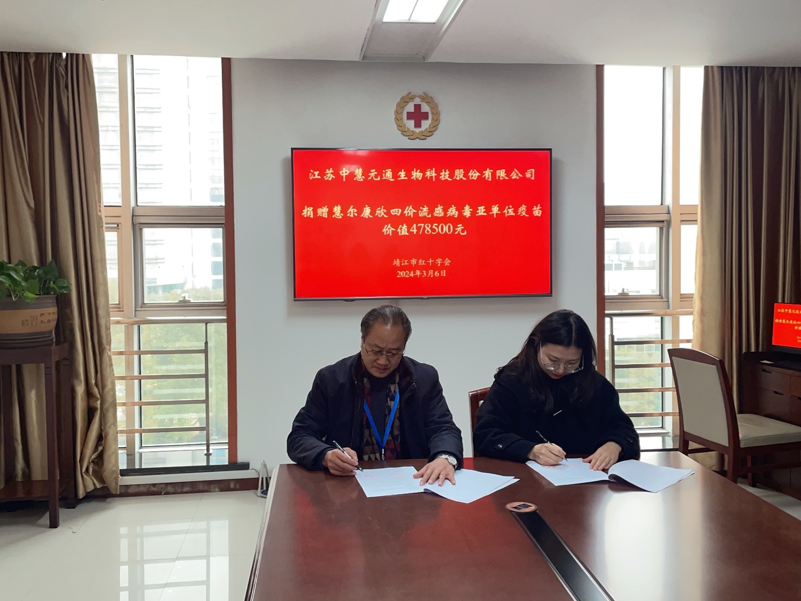 3月6日上午,江苏中慧元通生物科技股份有限公司向靖江市红十字会捐赠捐赠价值478500元的慧尔康欣四价流感病毒亚单位疫苗。
