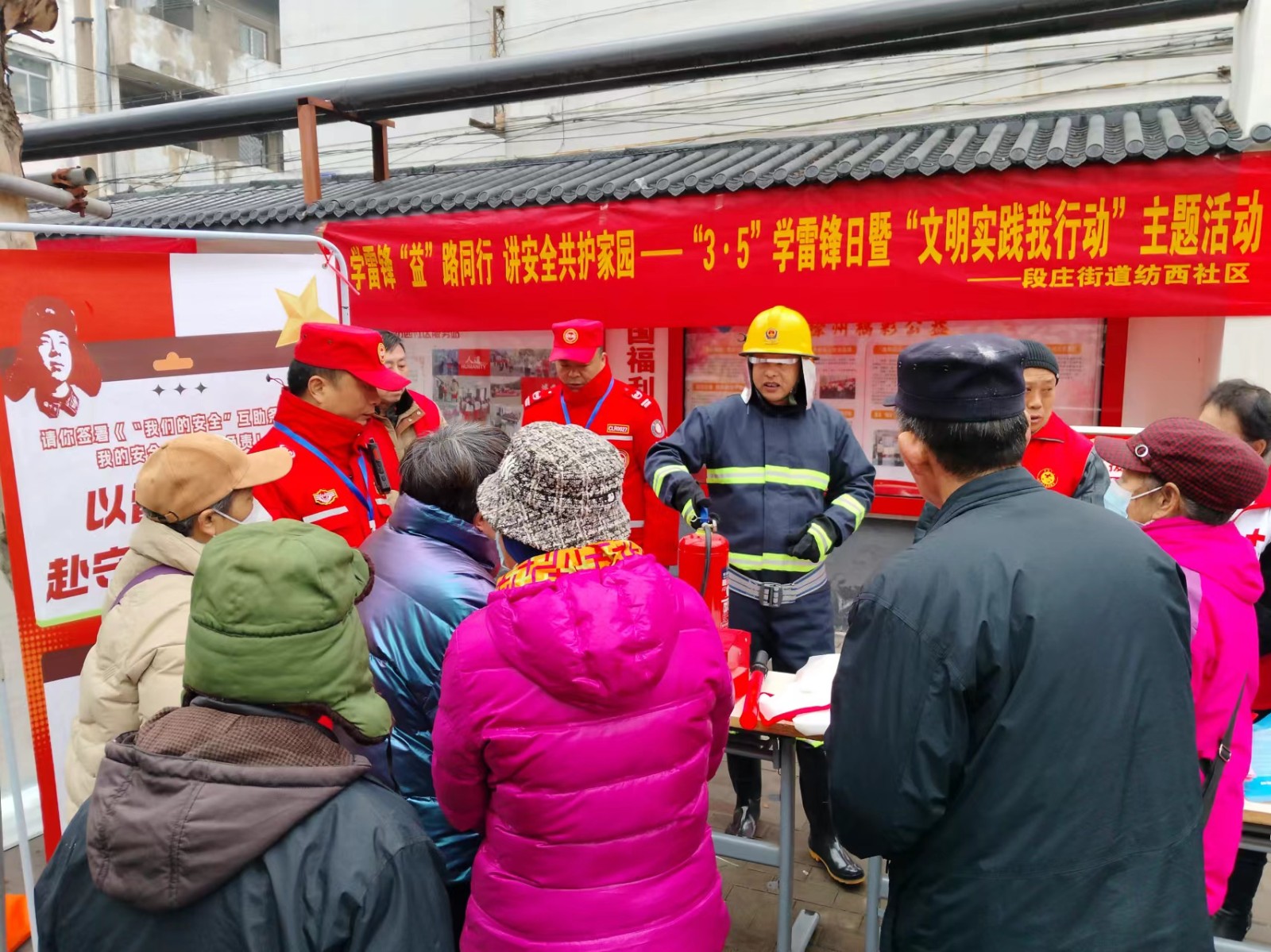 三月细雨送春风,雷锋精神共传承。今年的3月5日是第61个“学雷锋纪念日”。为学习贯彻习近平总书记对深入开展学雷锋活动的重要指示精神,弘扬和践行社会主义核心价值观,3月5日上午,段庄街道纺西社区红十字博爱家园联合辖区爱心企业单位、社区应急志愿服务队一同开展“3·5”学雷锋日暨“文明实践我行动 ”主题系列活动,现场分为“学雷锋,守护平安家园”消防安全培训及“学雷锋·暖心服务零距离”志愿服务两部分,共有辖区在职党员志愿者、社区应急志愿服务队、辖区居民40余人参加。