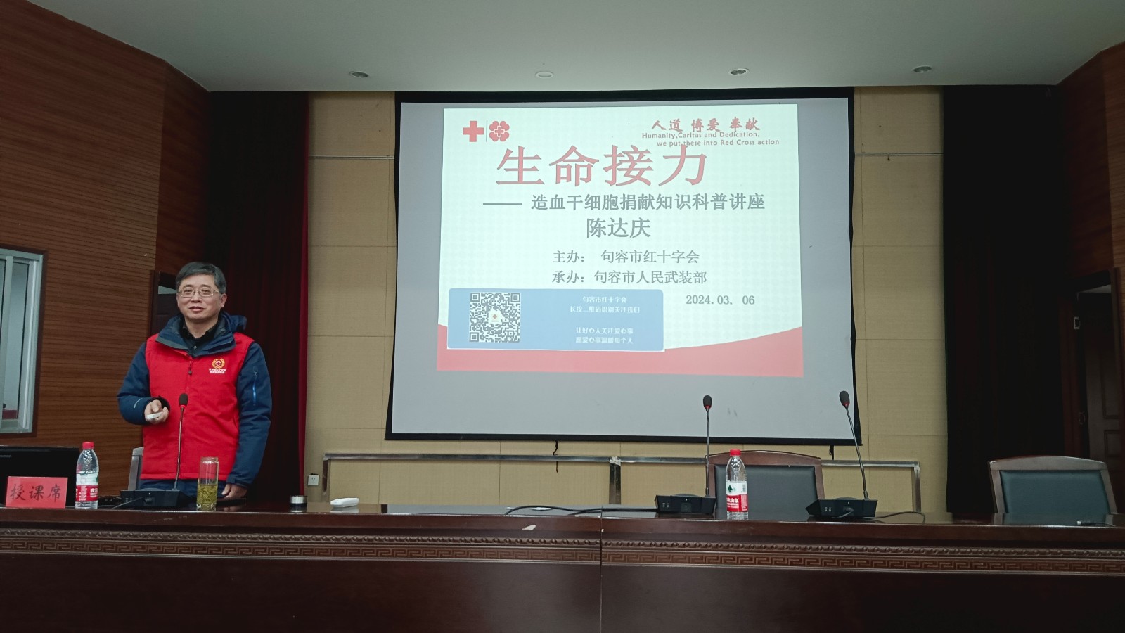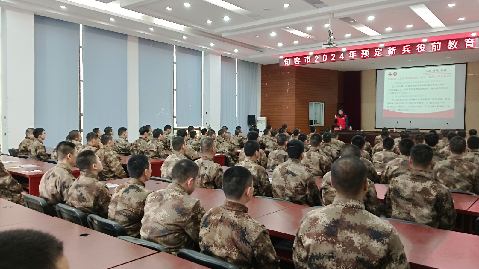 3月6日,市红会生命接力讲师陈达庆来到镇江国防园,为100余名句容籍2024春季预定新兵举办造血干细胞捐献知识科普讲座。