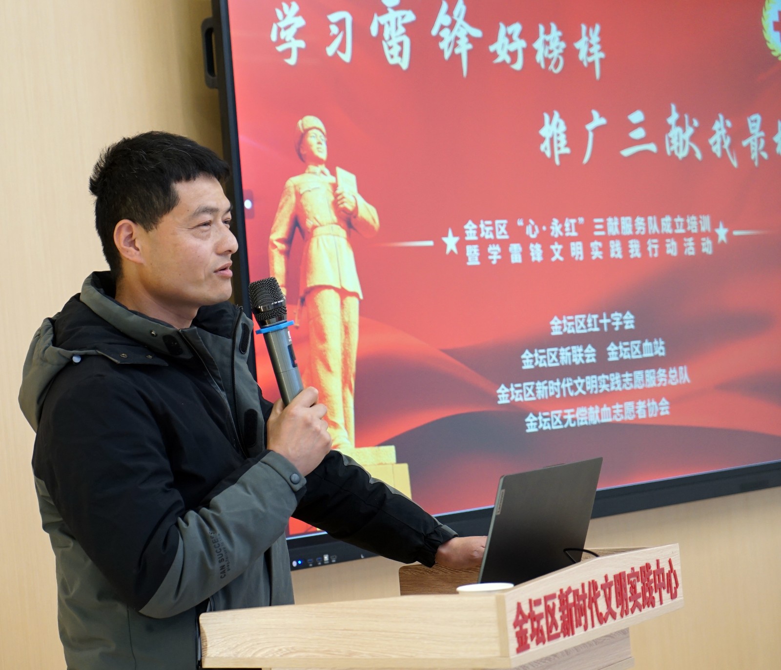 区红十字会党组书记、副会长李晶阳参加活动,并为“心永红三献服务队”授牌,李晶阳介绍了金坛7例成功捐献造血干细胞的捐献者事迹,他说“三献”工作就是雷锋精神的最好写照,金坛区成立“心永红”三献服务队,希望在场的人都是三献的工作者、志愿者,大家共同践行雷锋精神、积极推广三献。