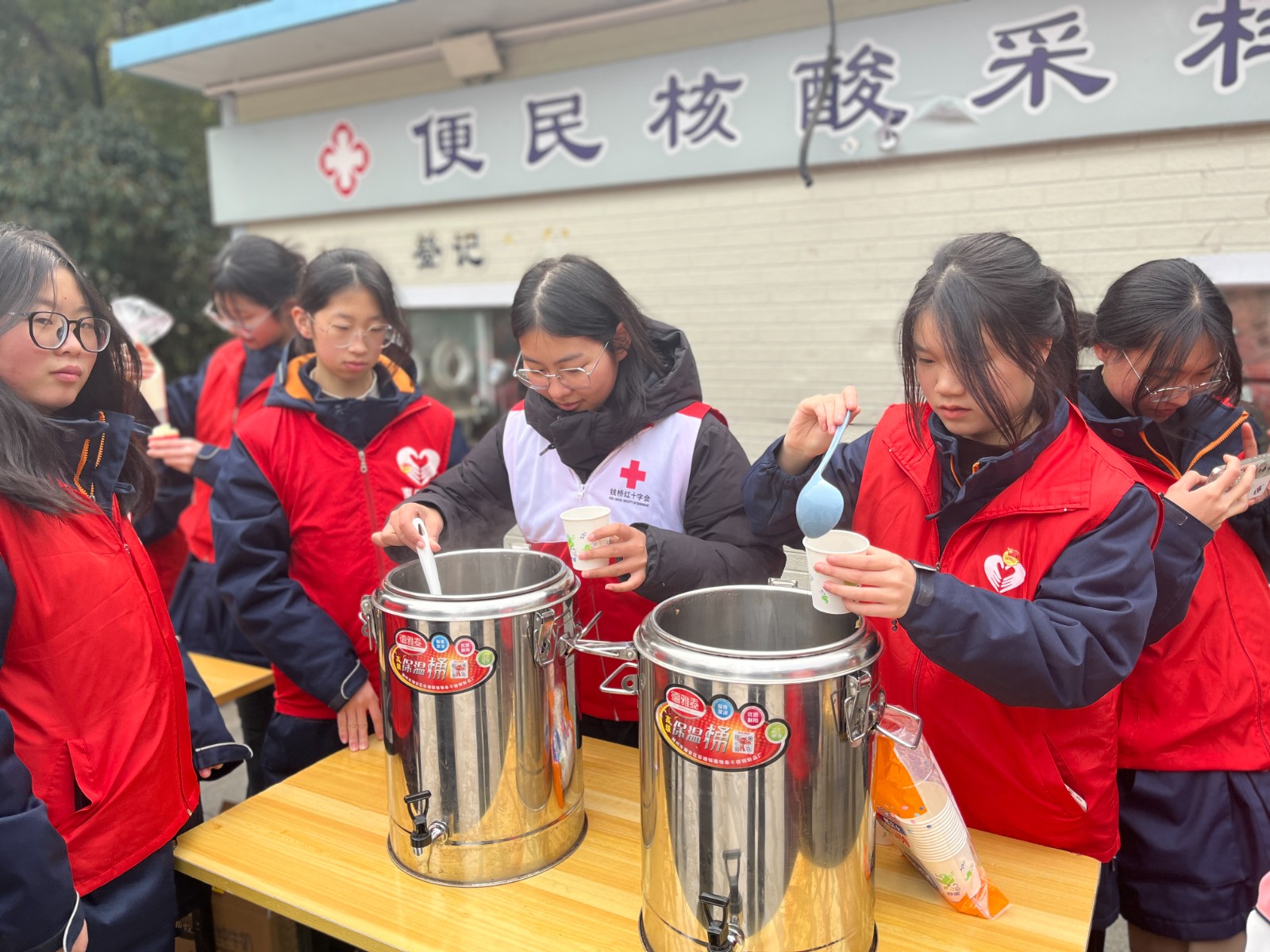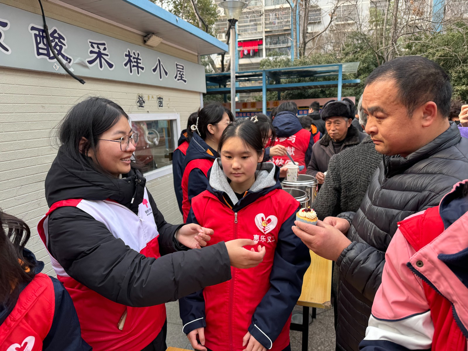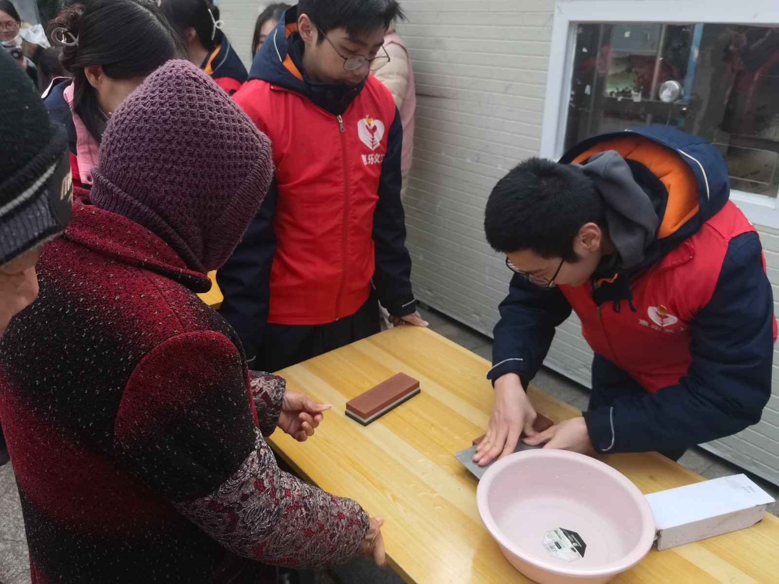 送姜茶和蛋糕环节也是这次活动的重要内容之一。只见志愿者们准备了热腾腾的姜茶和美味的蛋糕,现场分发给社区居民,让他们感受到了温暖和关爱。磨剪刀的服务也非常受欢迎,很多居民带来了需要磨的剪刀、菜刀等刀具,志愿者们耐心地为他们磨好,并且还教授了一些使用技巧。