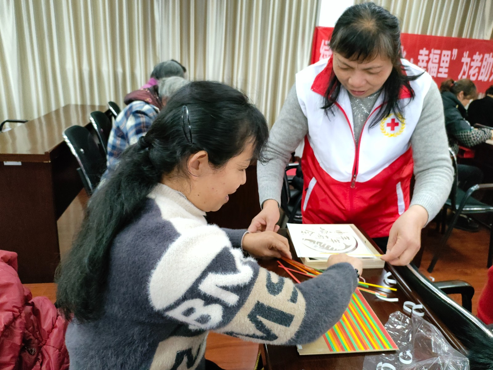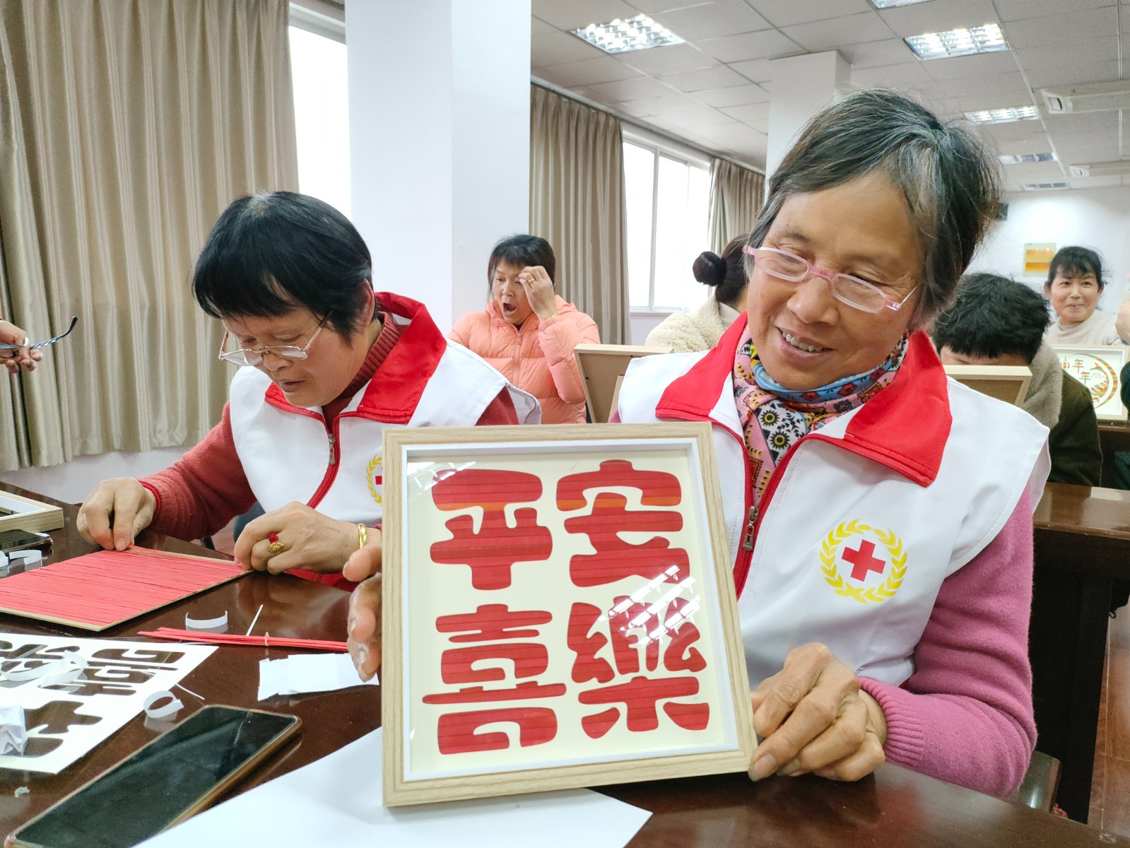竹编工艺有着悠久的历史,蕴含着中华民族劳动人民辛勤劳作的结晶。活动伊始,志愿者老师首先向大家详细介绍了竹编工艺的历史、制作流程以及主要特点。在对竹编工艺有一定了解后,大家在老师的指导下开始动手编制竹条。每个人都聚精会神低头编织,沉浸在编织的乐趣中,现场氛围轻松愉快。一挑一压,竹条在居民们的指尖交互缠绕,散乱的篾片经过大家的巧手编织渐渐有了形状。邻里间还相互合作,不久,一幅幅精美绝伦的竹编艺术品就呈现了出来。“柿柿如意”、“平安喜乐”、“我爱我的祖国”、“中国梦”……每一幅竹编画都蕴涵着对居民们和祖国美好的祝愿。大家看着自己亲手制作的节日礼物,爱不释手,纷纷感叹非遗竹编工艺的独特魅力。