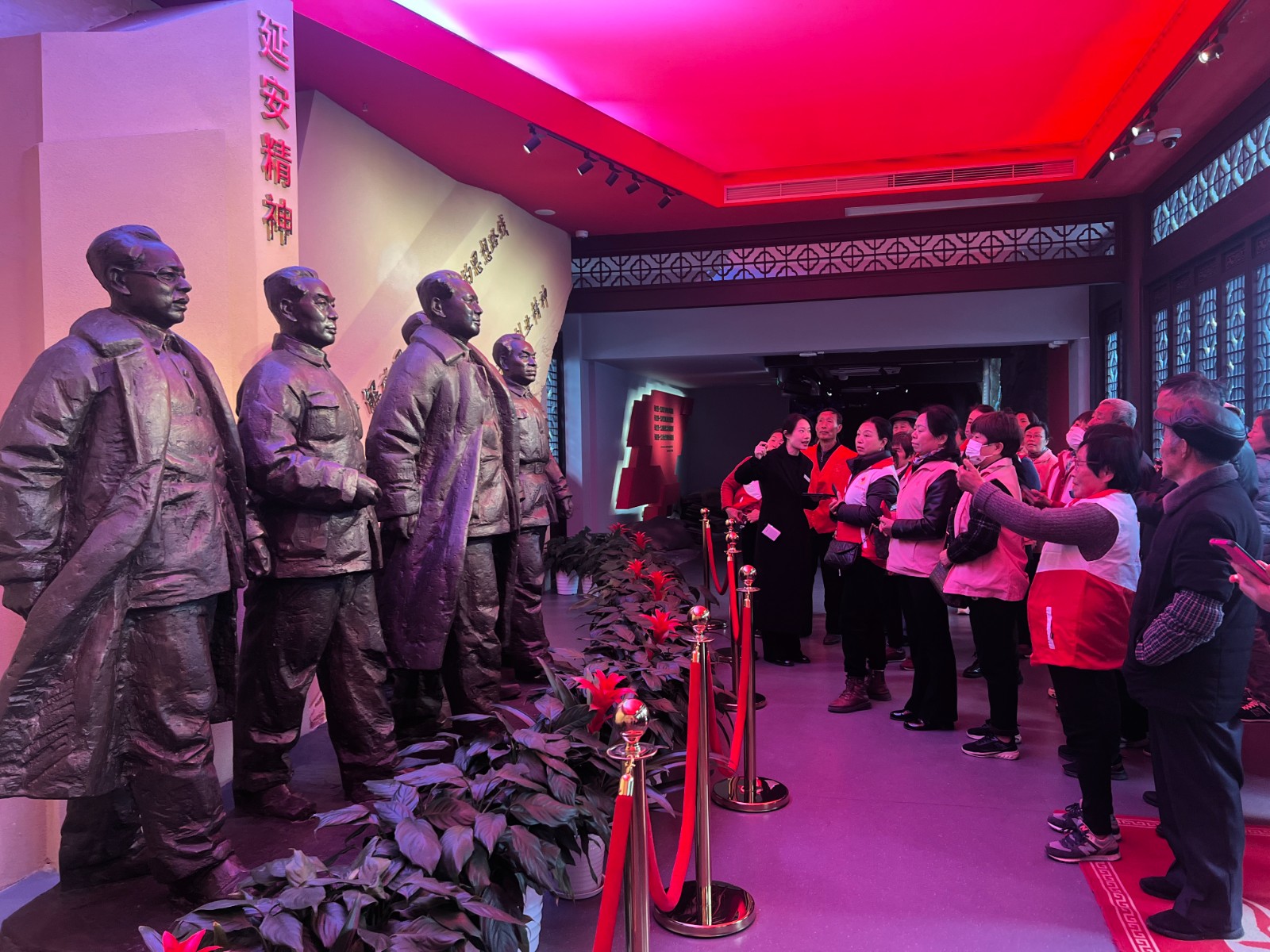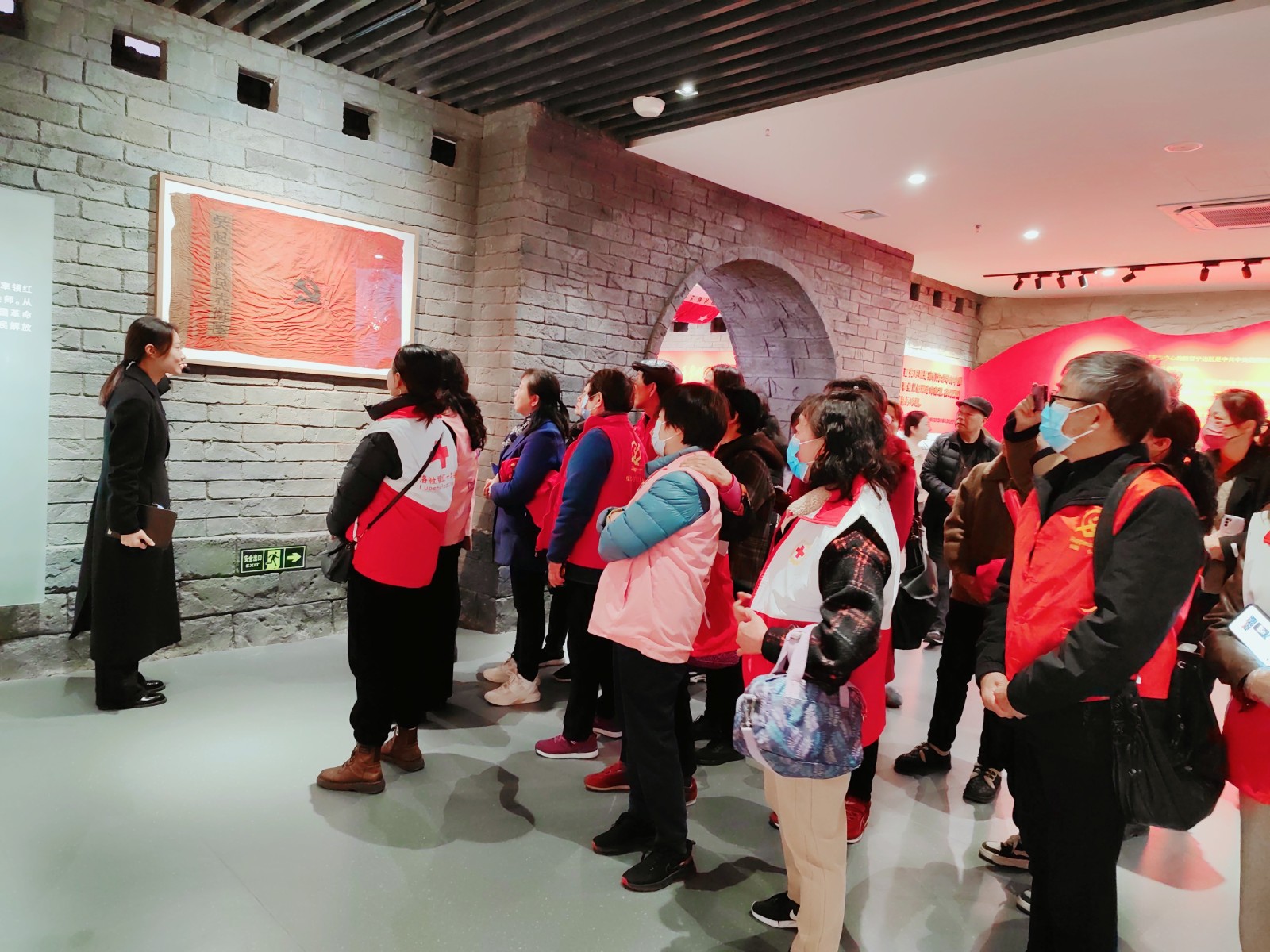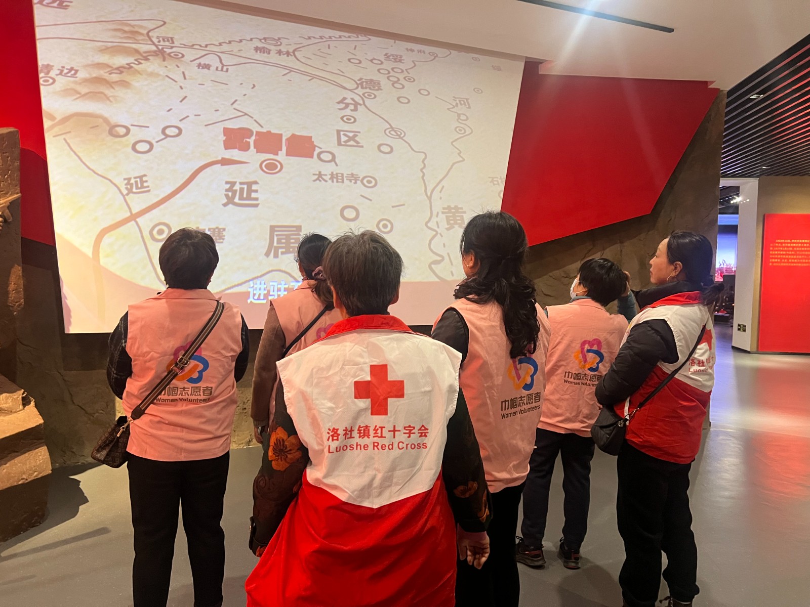 大家一路走一路看,仔细聆听讲解,不时驻足观看。在由多媒体手段复原的壶口瀑布前,红十字志愿者们带领大家一起唱响《黄河大合唱》,共同追忆革命先辈奋勇杀敌的峥嵘岁月。在场馆内,大家还看到了难得一见的“开国大典”高清彩色影像,重温那激动人心的一刻。在巨大的安塞腰鼓前,大家驻足抚摸,感受扑面而来的“延风”。