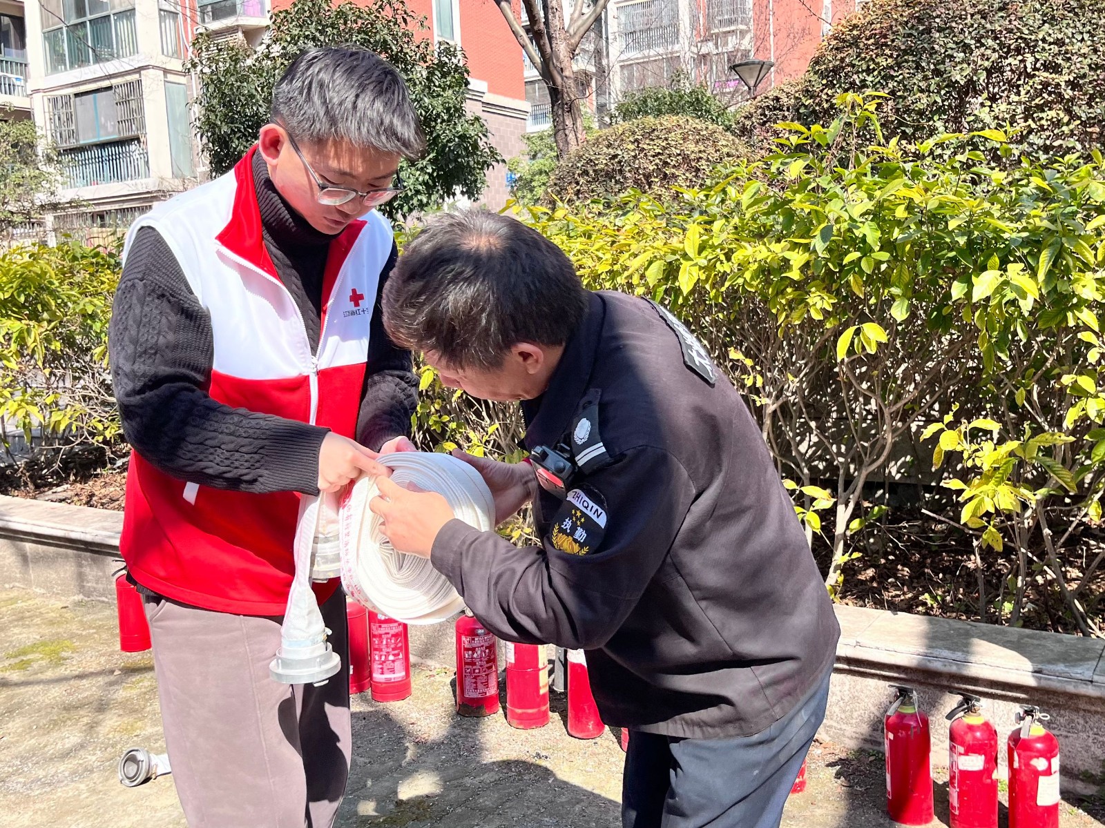 “这是消防水带、消火栓水枪,打开消防栓,取出消防水带,向着火源点延伸展开,接上水枪,连接水源,手握水枪头及水管,打开水阀门,即可灭火”。红十字志愿者耐心教大家安装水带水枪及灭火等基本操作。