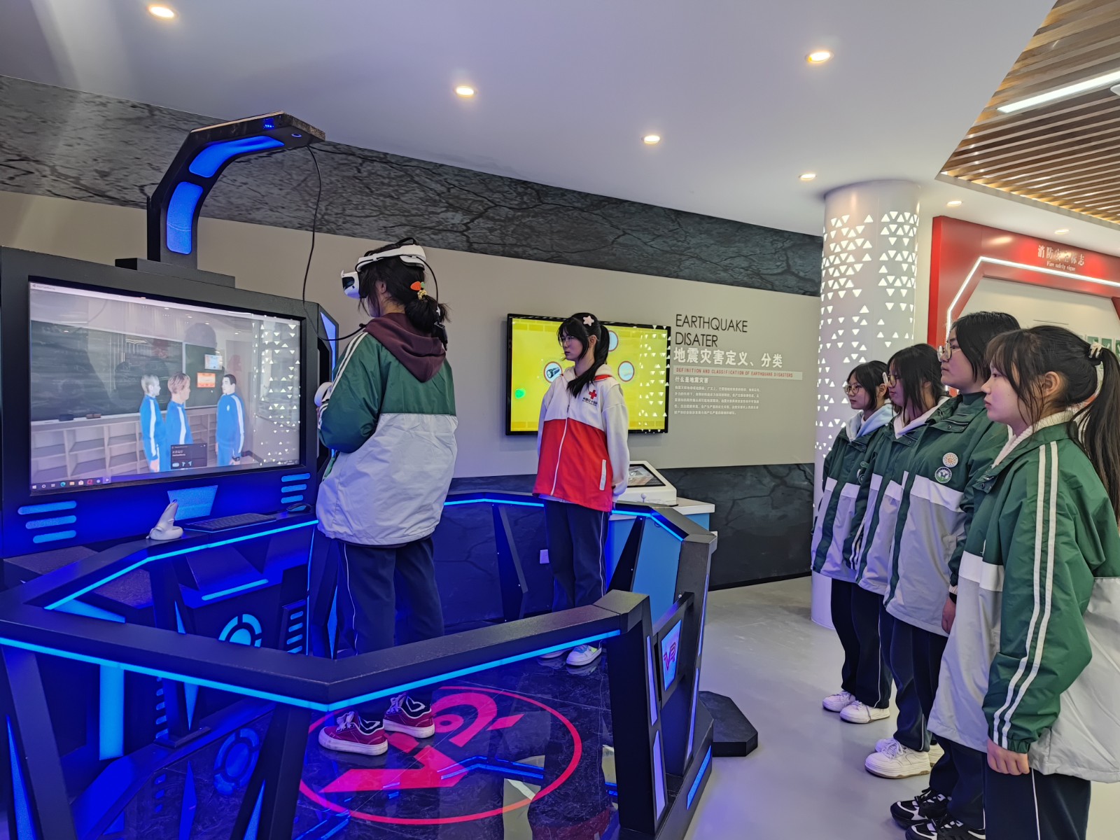 校园安全体验区,使用的是一套沉浸式VR无限行走平台,通过平台上的传感器和穿戴设备,身临其境地感受拟真场景。无限行走平台有多套定制场景,如校园防霸凌、防性侵、防盗抢、防疫、防爆避险、正当防卫等,通过体验模拟环境中的各类事件,结合文字与语音的解说,树立自我防范意识,提升处理突发事件的能力。