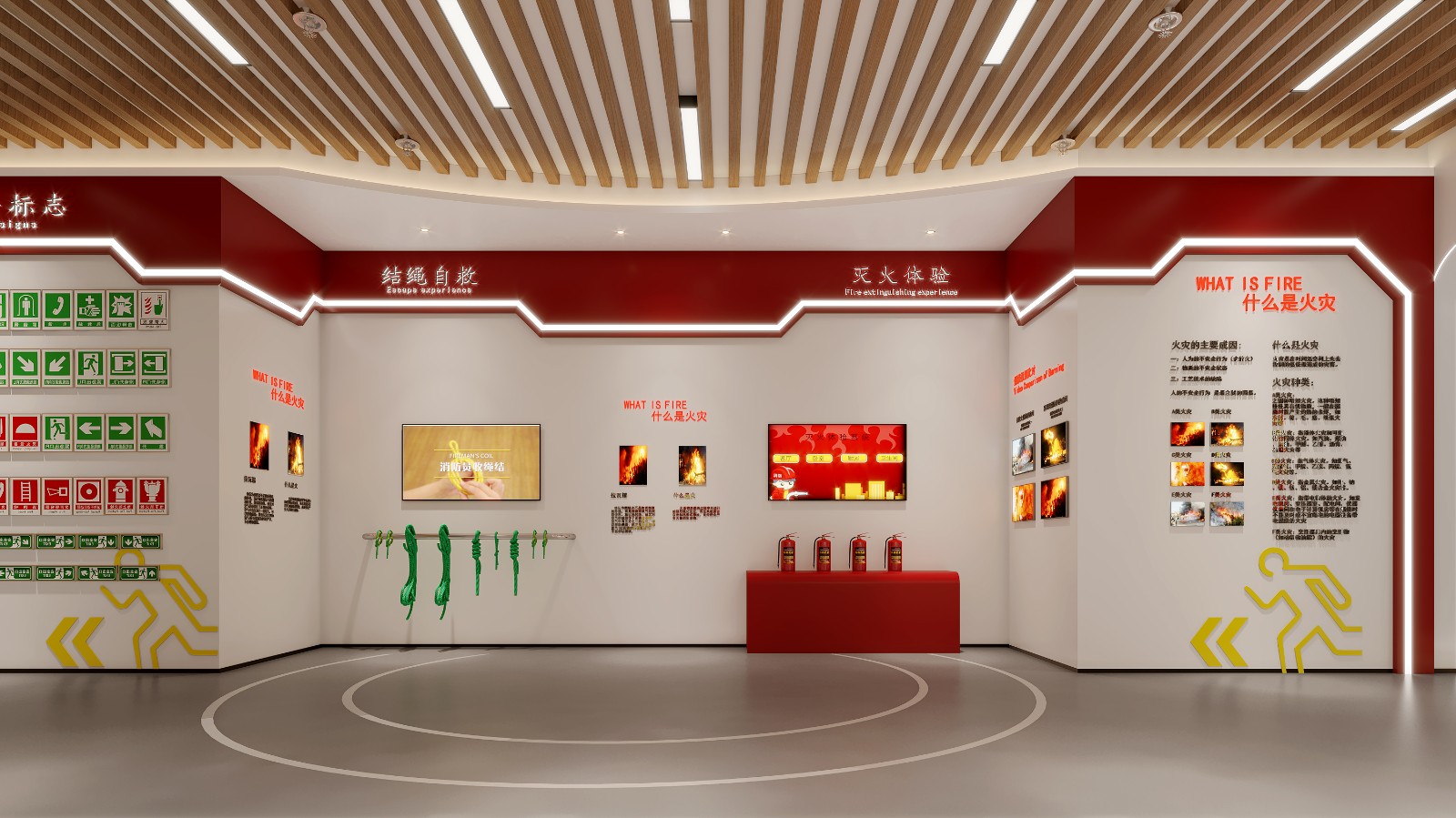 消防安全体验区,这里搭建了多个不同的体验场景,学生可以通过灭火体验、逃生体验、消防标识和器材的展示等学习,普及各种消防知识;在MR(混合模拟)灭火体验中,学生通过佩戴VR眼镜,手持模拟灭火器,在沉浸式的交互中模拟真实的灭火场景,体验从发现火情到扑灭火灾的整个过程,最后系统还可以对学生的操作进行打分,借助虚拟现实技术,增强学生对消防安全意识的理解。