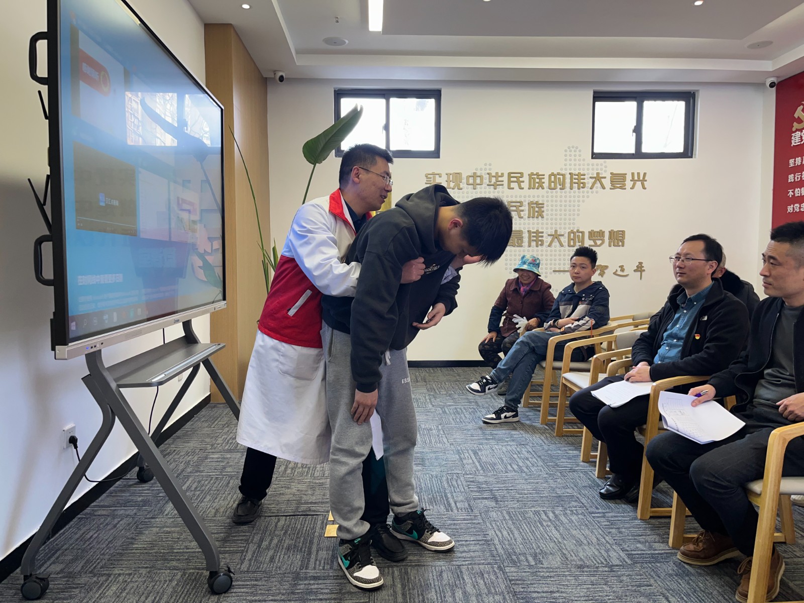 培训伊始,陈医生以简明易懂的方式进行讲解,结合实际案例和图文并茂的课件为大家讲解了成人心肺复苏的基本原理和步骤,包括胸外按压、人工呼吸、自动体外除颤器的使用。随后,居民们进行了实操体验。陈医生准备了相关人体模型和模拟器材,让党员们亲自体验并模拟实施心肺复苏。他耐心指导居民们正确的手法和步骤,并纠正他们在实践中可能存在的错误。通过反复的实操训练,居民们逐渐掌握了正确的急救技能。除此之外,此次培训还设置了讨论互动环节,陈医生解答了居民们的疑问,并分享了更多有关心脏疾病和急救的知识,还为居民们演示了海姆立克急救法的正确操作方法。