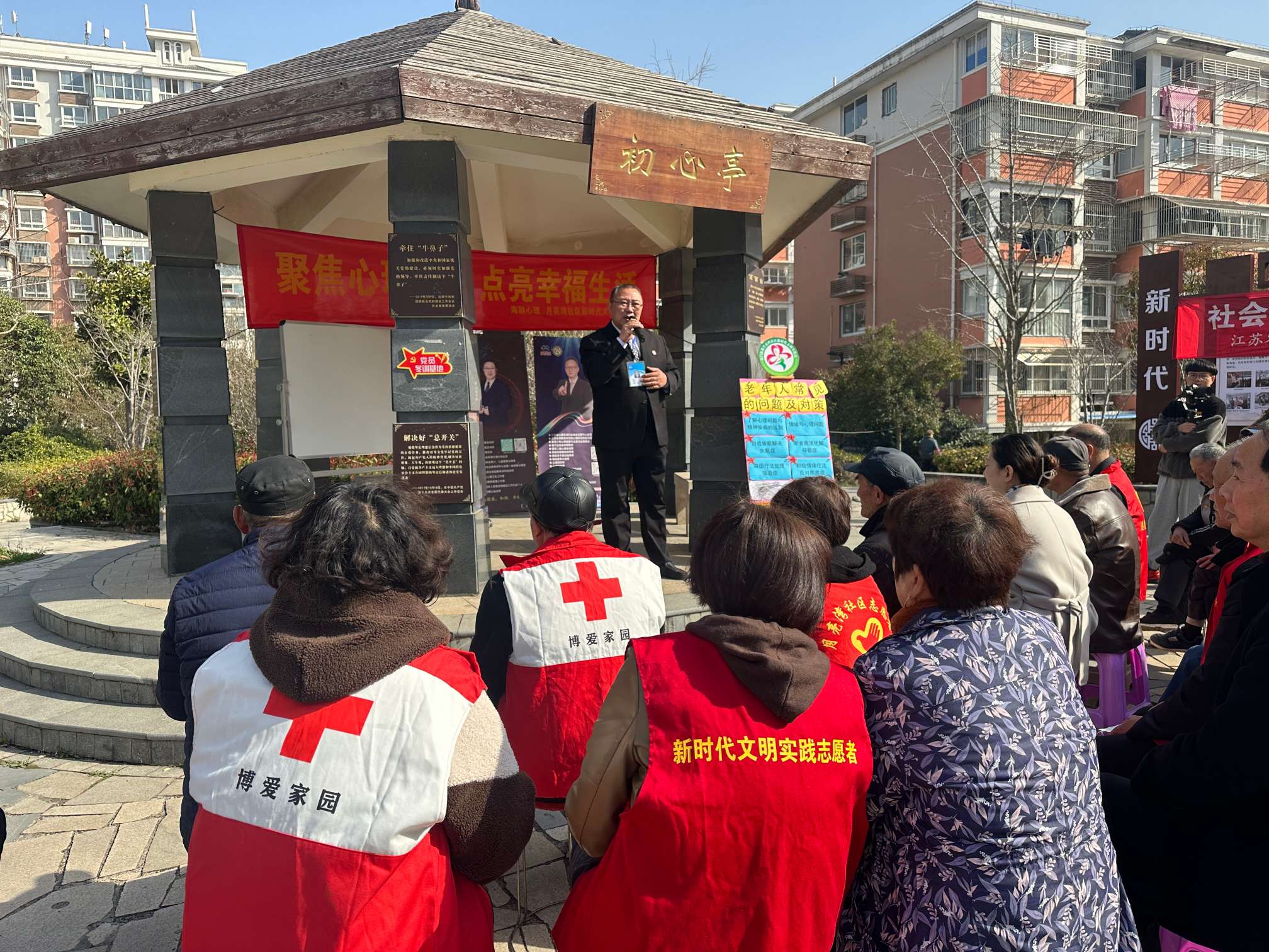 活动中,大家围坐在初心亭周围,心理咨询导师大江、宋文彬分别以科普讲座、沙龙互动的形式向辖区志愿者、党员、退役军人、居民群众宣传健康心理知识,从健康的定义出发,通过通俗浅显的语言,让大家了解心理问题与精神疾病的区别、负面情绪与心理问题的关系,以及如何解决老年人常见的失眠症、抑郁症、强迫症、焦虑症等问题。同时结合身边发生的案例,为大家分享一些减压和情绪管理的小技巧。大家纷纷表示,讲座既有趣也“干货”满满,让大家释放心理压力,保持良好的精神状态,以更加阳光的心态积极地投入到今后的生活中。