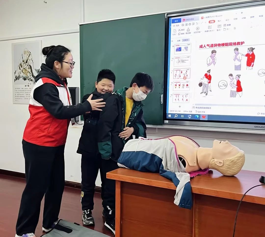 纸上得来终觉浅,绝知此事要躬行。活动中,马老师邀请学生担任志愿者,进行示范操作和现场演练,讲解心肺复苏和海姆立克法的操作要点,手把手地纠正不正确的操作方式,教会大家如何抓住急救“黄金四分钟”。活动现场气氛热烈,同学们深深投入到老师别开生面的讲解中,积极主动地参与急救知识的讨论。