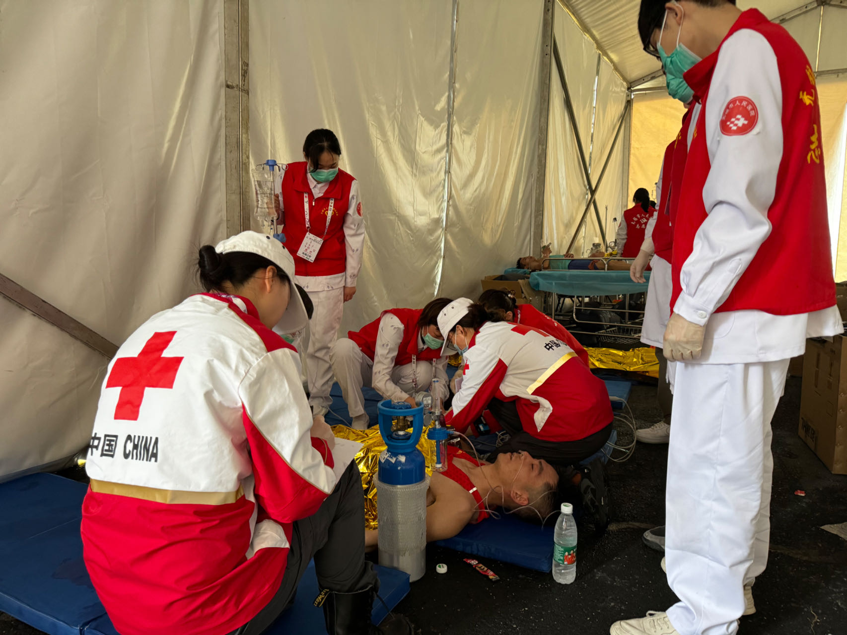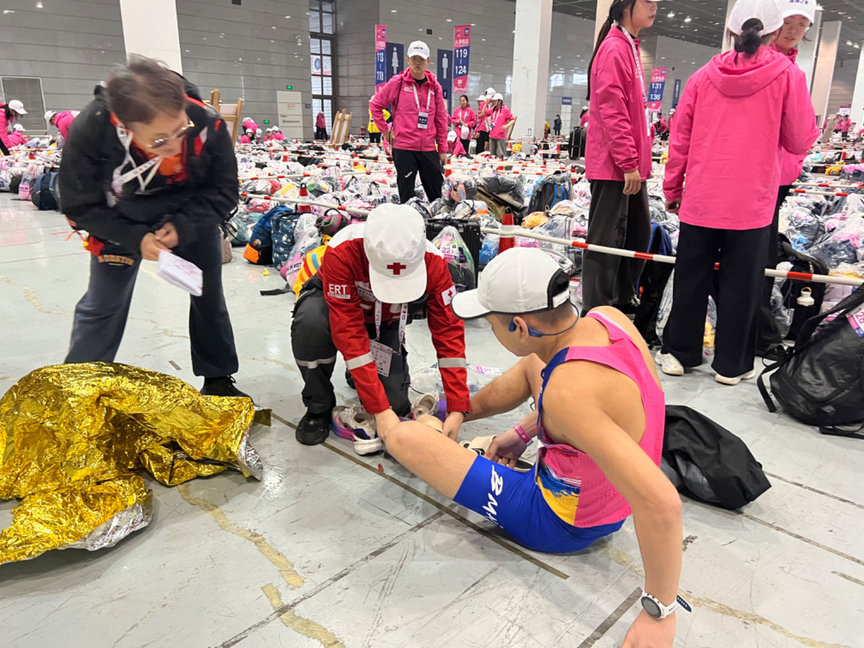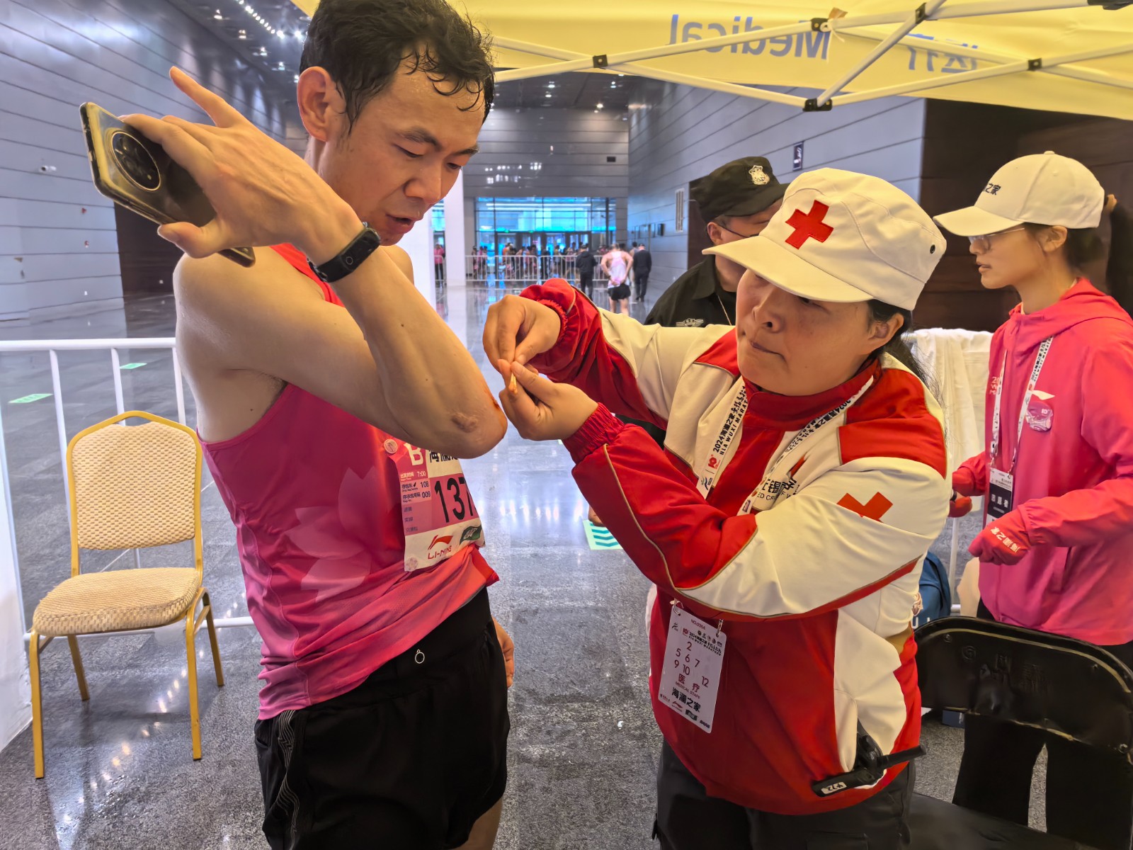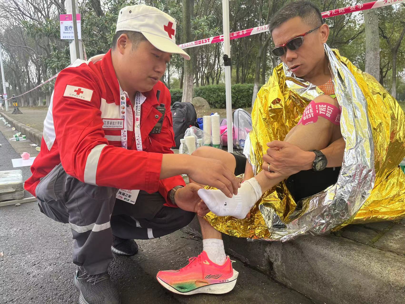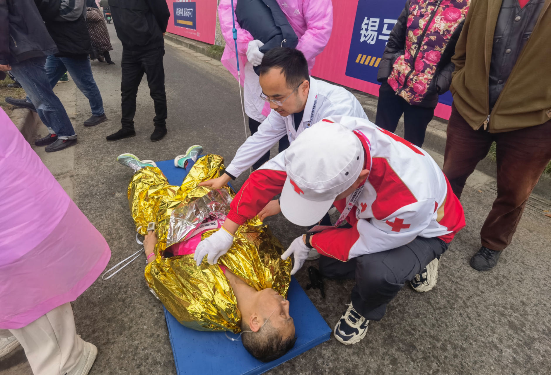 比赛期间,身穿红十字统一服装的志愿者冒雨坚守在赛道上,集中精力,时刻关注跑者状态,随时准备处置突发事件;听从指挥,支援赛道后段点位,以专业的技能和满腔的热情全程护航无锡马拉松赛事。特别是比赛接近结束时,当一些体力不支,身体不适或关节肌肉损伤的选手陆续被送到终点医疗站接受救治时,志愿者们积极协助医疗救护人员转运伤员,并做好伤口处理、包扎等工作。