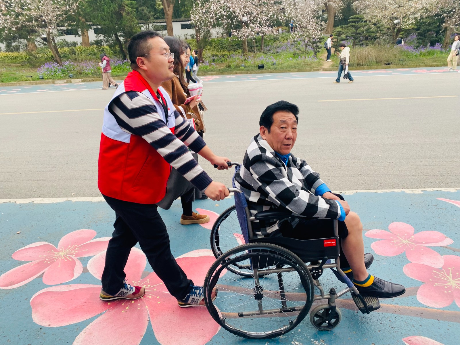来自安徽合肥的张女士下游船时,不当心把脚崴了,脚背肿了很大一个包,在救护站进行喷涂、冰敷后略有好转,但因樱花谷还未游览下午就要回程,张女士显得心情十分低落。志愿者闻讯后,自告奋勇用轮椅推着她到樱花谷游览。张女士和陪同的游客对志愿者的无私帮助连声道谢:“下次一定还要来鼋头渚游玩,无锡真暖!”