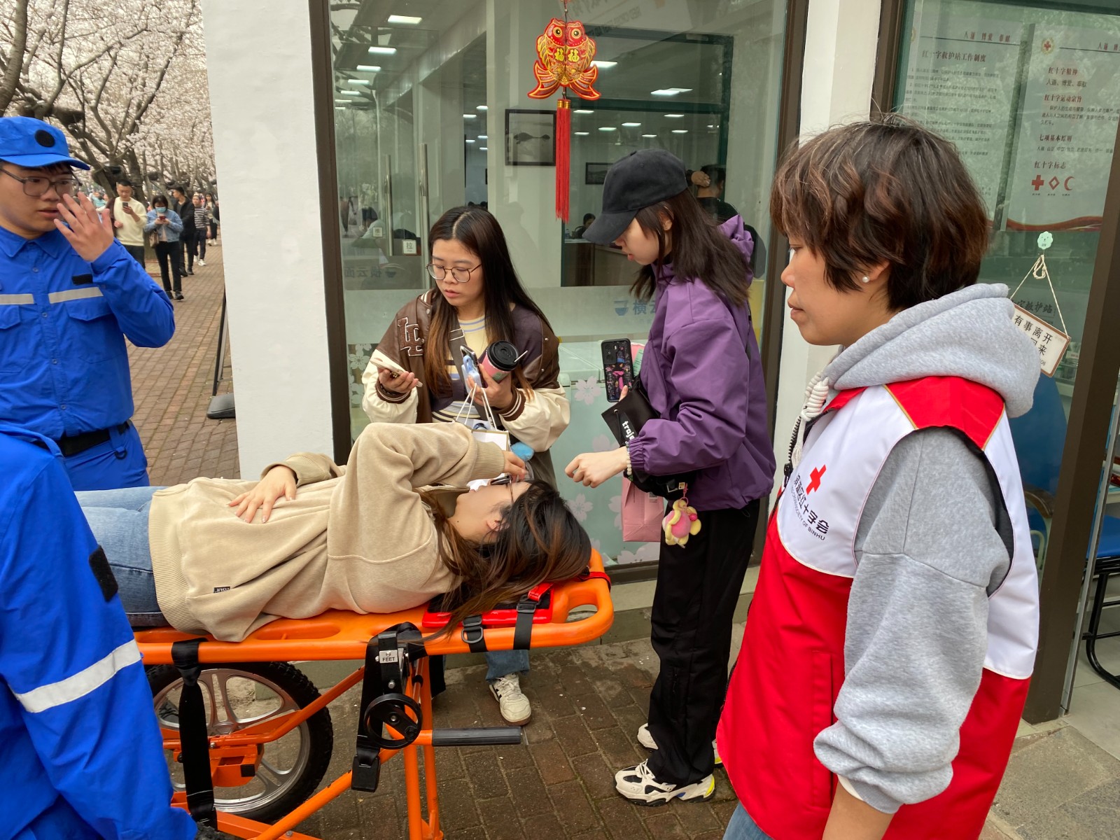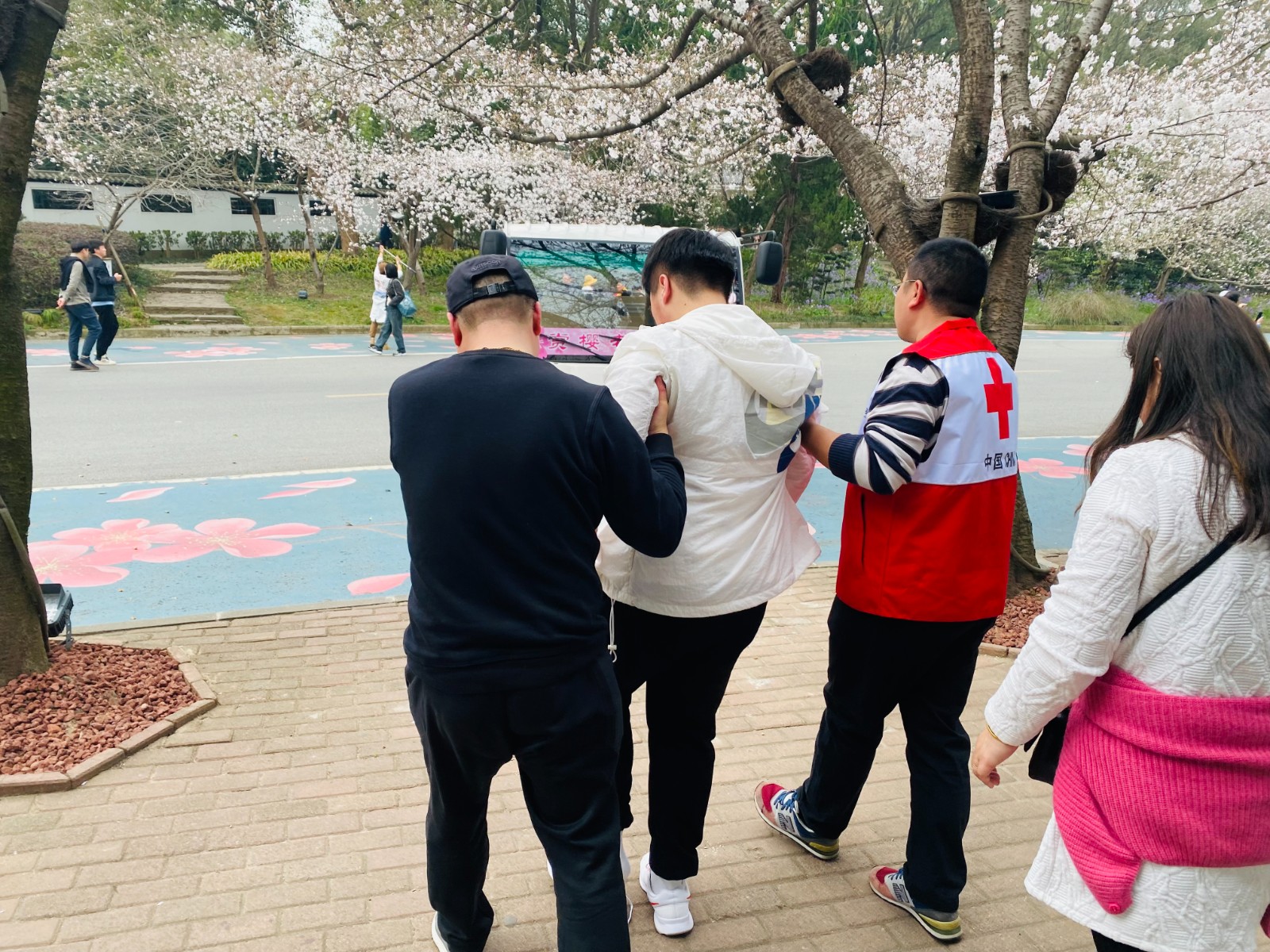 来自上海的一位女士,赏花时不慎摔倒,接到家属求助,红十字救护志愿者第一个赶到现场,初步检查后确定脚踝是骨折,向景区管理员汇报情况请示处理方案,随后医生和蓝天救援队赶到,进行简单固定后,用担架转运至救护站门口上了120,从接到求助至受伤游客送上救护车仅仅用了半小时。
