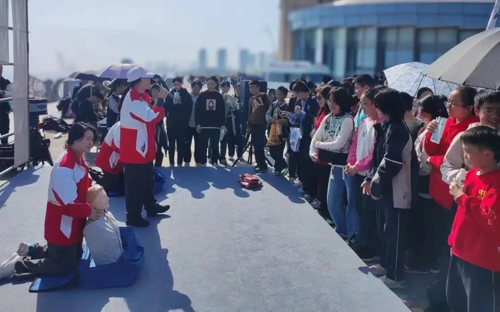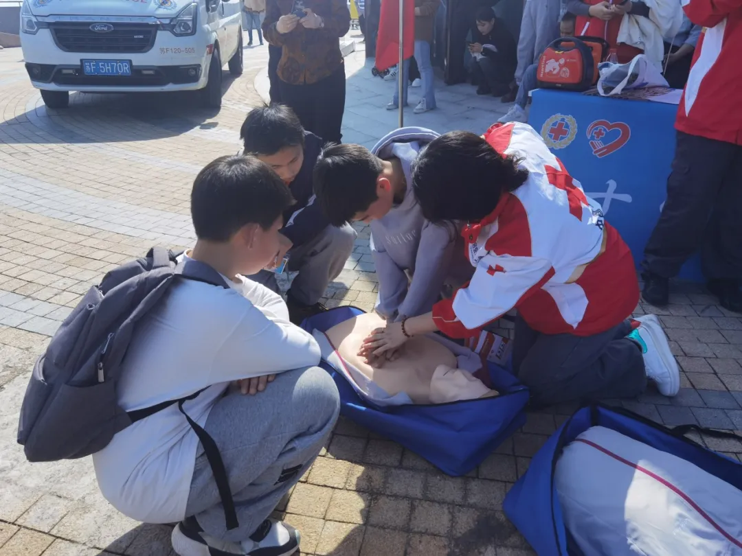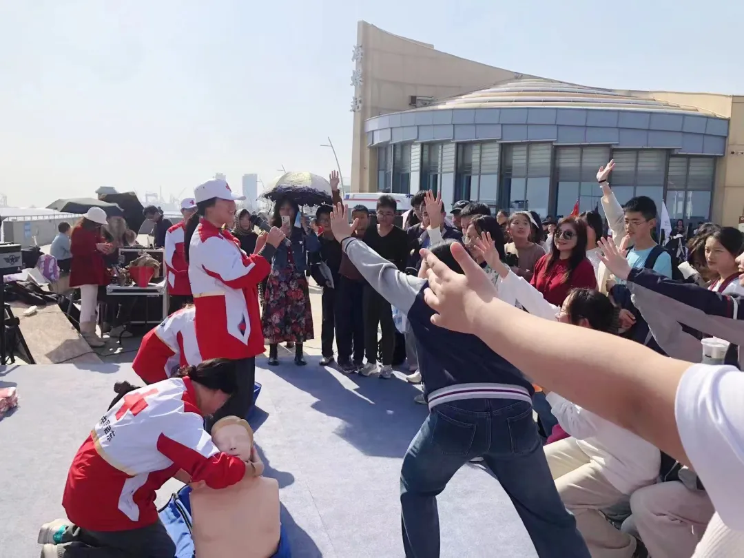 随后,为进一步普及应急救护知识,提高游客们应对突发事件和意外伤害的应急救护和自救互救能力,党员志愿者为游客们详细讲解并操作演示了心肺复苏、AED使用、海姆立克急救法等急救技能和相关知识,吸引了一大波游客前来学习并且进行实操。