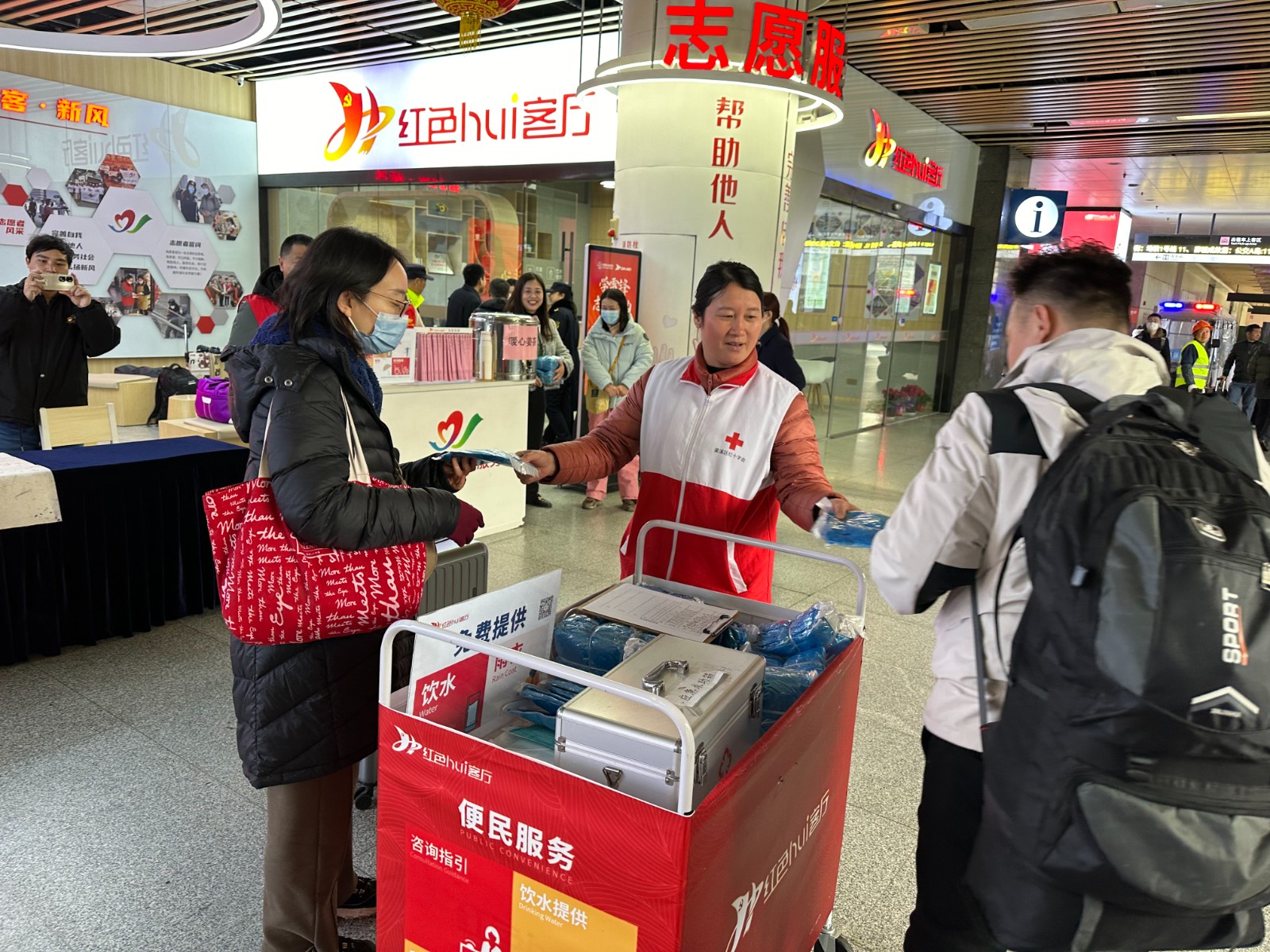 大雨还在下,热情周到的红十字志愿服务驱散了雨日的阴霾,让旅客们的心也暖了起来。