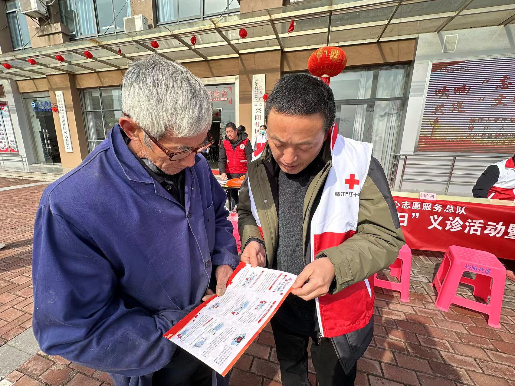 3月1日上午9:30,靖江市人民医院志愿者来到兴阳社区,为社区群众提供量血压、测血糖、义诊及健康宣传等服务。临床各科室专家志愿者仔细聆听患者的诉求,了解患者的身体状况,耐心回复患者的健康咨询,给他们提供合理的保健意见及治疗方案。