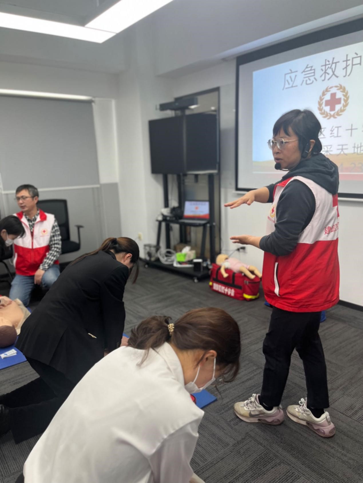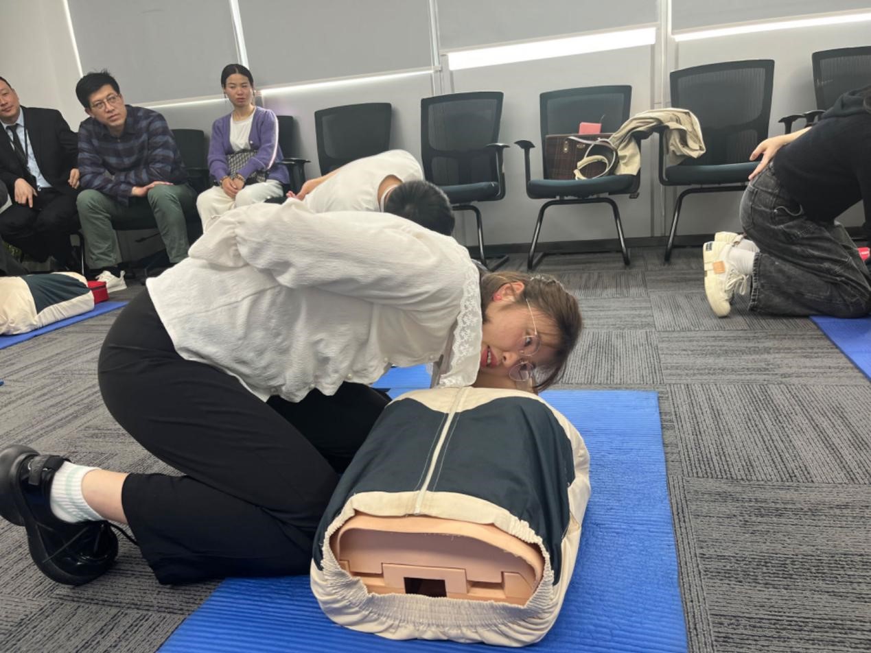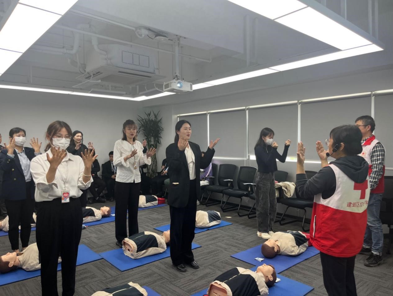 “耳朵靠近被救助者鼻子,眼睛观察其胸部有无起浮,查看对方是否还有呼吸。”“刚才的求救失败请周围的人拨打120时一定要确认对方点头了,愿意为你拨打,如果对方不愿意,不要纠缠,马上换其他人求助”……将近两个小时的培训现场,徐海和建邺区红十字会的工作人员向受训员工介绍了心肺复苏术应用的条件、方法以及AED的使用过程,并请每一位员工在心肺复苏人体模型上练手,从旁给予一一纠正。“你们按压的力度太小了,这样起不到什么作用,要按压深至5到6厘米。胳膊要伸直,屁股向前一点,这样按压起来才能有力。”“人工呼吸时要保证人体模型的胸部鼓起来。”“现在练习时你不吹气,救人时很可能吹不起来。”……徐海的授课条理清晰,和红会工作人员针对每位受训员工进行了细致指导,他生动的讲述不时让受训员工发出会意的大笑,既缓解了训练的枯燥,也使员工们从一开始的一脸茫然到逐渐理解和投入,每个人下场操作时都能够努力练习。“授课的老师讲得非常具体,也很有意思。一开始坐在那听时以为自己都会了,等到下场训练才知道很多动作做起来就没那么容易了,我个人的感受到是心肺复苏操作一是要多练习,熟悉整个流程,同时它也是一个体力活,施救时最好还能有其他会的人一起救。”一位受训员工表示,在建邺区红十字会老师的指导下,受训之后他感觉对心肺复苏术有了大致掌握,后续经过自己的练习,希望能在自己家人、身边朋友有急需的时候能够帮助他们。