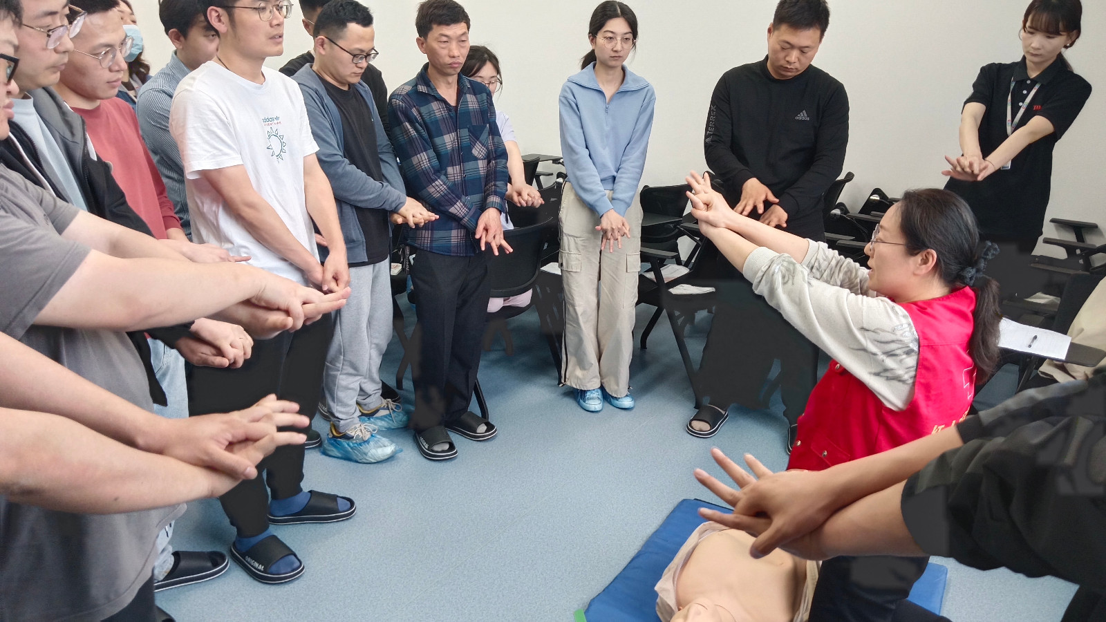 上午的培训由讲师刘碧俊讲授现场急救知识要点。针对意外伤害造成伤患者心跳呼吸骤停的情况,刘碧俊向大家重点传授了体外除颤仪的应用、心肺复苏术、海姆立克急救法等应急救护技能,并将职工们分成两个小组,和讲师沈云霞一道,分别使用模拟救护假人进行急救示范和指导,让所有学员亲手“上阵”进行急救练习。