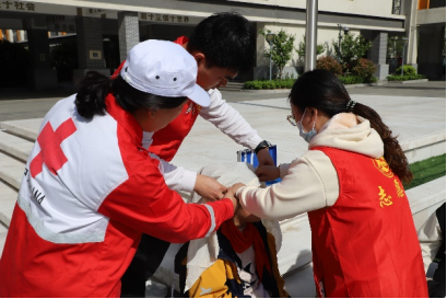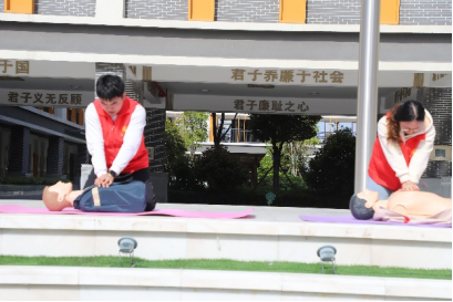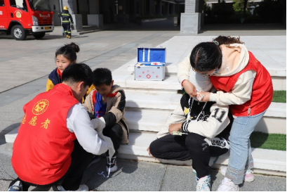 区红十字志愿者、学校里接受过应急救护技能培训的老师组成医疗救援小组,现场演练对紧急疏散过程中受伤人员开展急救,演练项目包括心肺复苏、外伤包扎等。