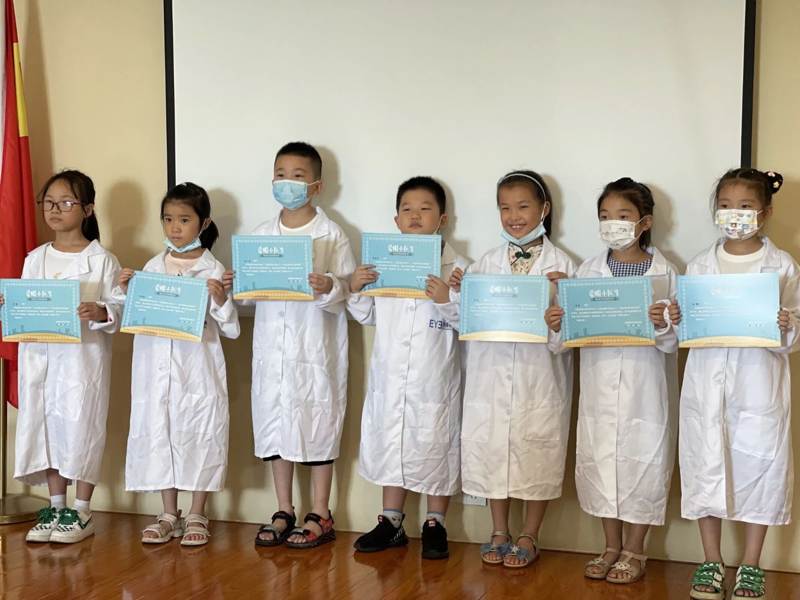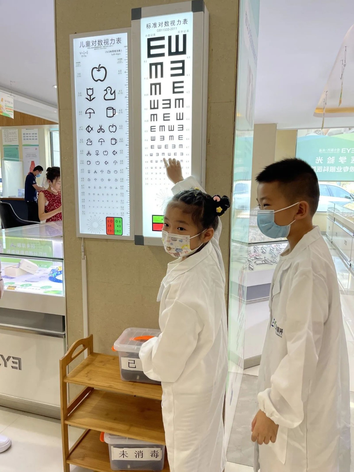 在眼科医院,孩子们争做小小眼科医生,拿起视力棒,帮助人们测视力,学着做些力所能及的事情。