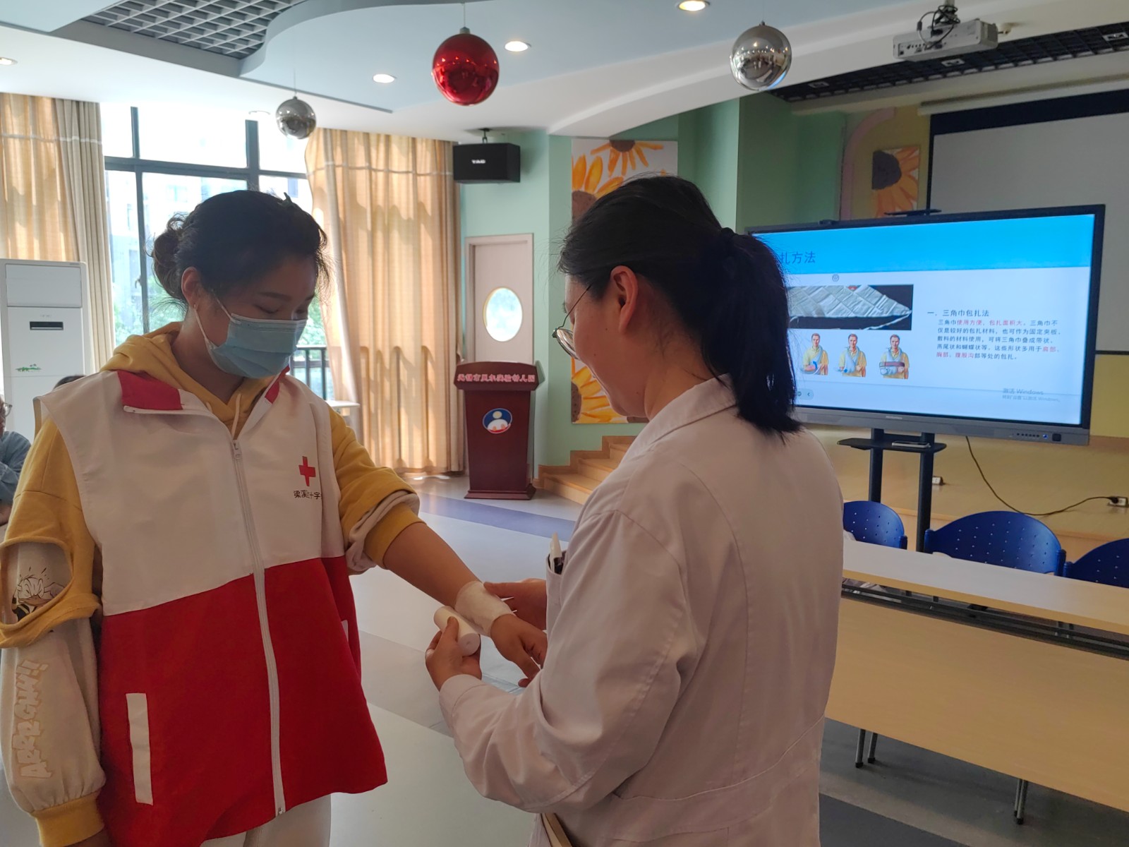 培训现场,杨医生紧扣应急救护知识重点,结合教职工的行业特性,重点讲解了急救的场景、操作步骤及注意事项后,再让教职工参与实践操作,旨在帮助大家切实掌握气道异物梗阻、常见创伤包扎的初级救护知识和技能。