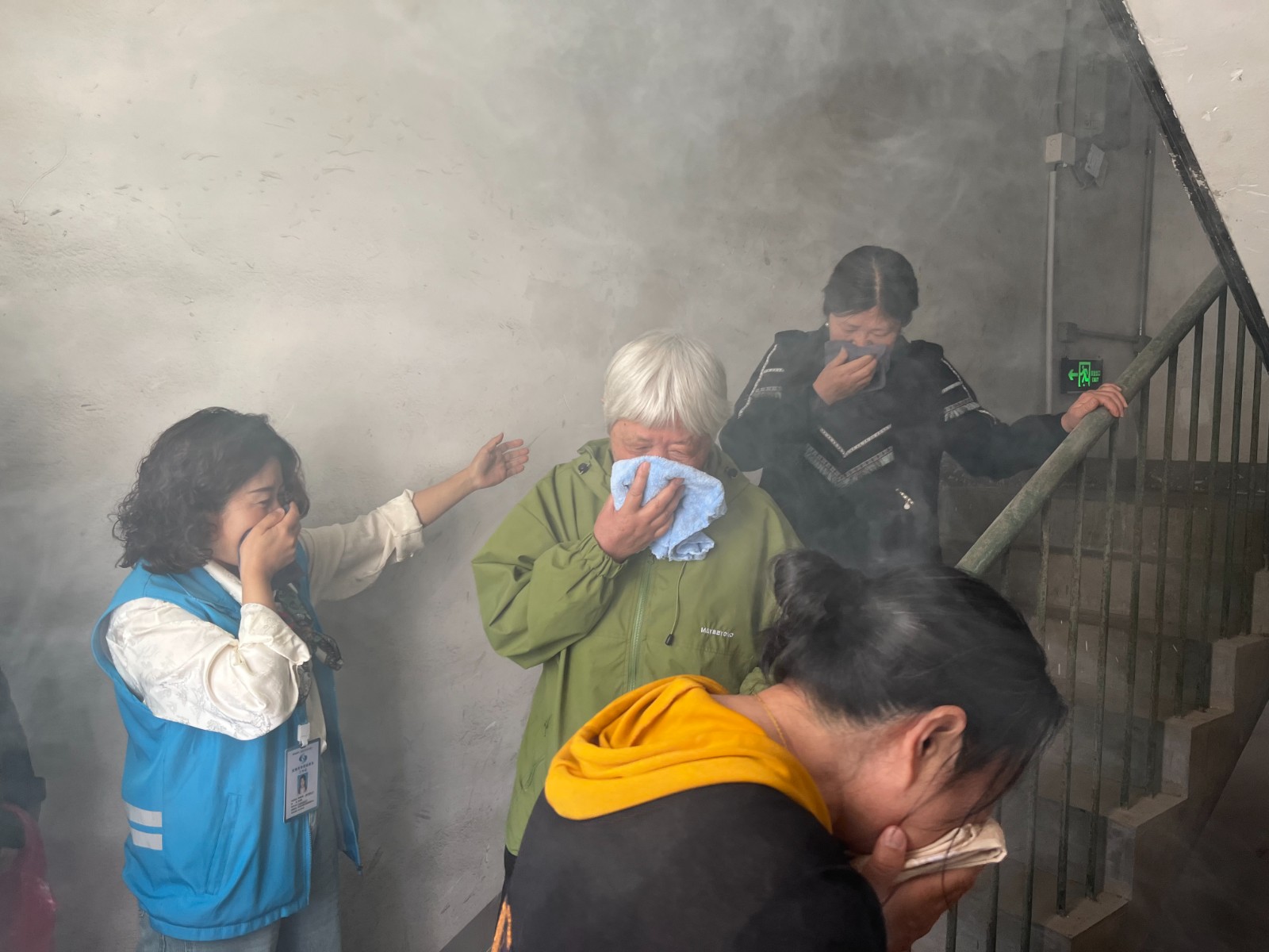 在演习现场,“火势正在蔓延”,社区工作人员第一时间查看火情,并拨打119报警。同时,“灭火行动组”迅速提取消防器材进行初期灭火,为消防官兵的到来争取了宝贵时间。在安全疏散员的指引下,居民们用湿毛巾捂口鼻,扶着墙壁、沿着楼梯间的消防安全指示标志半蹲弯腰迅速前行,快速有序地从居民楼安全撤离至疏散点。有个别“居民”因浓烟过多吸入导致昏迷,红十字志愿者立即抬至疏散点进行应急救护。