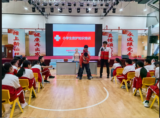 本次培训邀请了区红十字会专业讲师曹雪峰主任前来授课。 “当意外发生时,掌握必备的急救技能,关键时刻能救人一命……”曹主任通过浅显易懂的语言和现场示范、互动的方式,为师生讲解红十字运动知识、救护概论、海姆立克急救法、自动体外除颤器使用方面的知识。同时,曹主任还对如何应对突发意外、道路突发事故等危险情况进行了详细地解释和演示。培训现场,同学们积极参与问答,踊跃提问,纷纷上前进行实践技能操作。六(四)班学生胡佳晨在活动中举手发言,“参加此次培训是一次极其深刻且意义非凡的体验,让我认识到急救不仅仅是医护人员的专业技能,更是我们每一个人都应掌握的基本生存技能,在未来的生活中,这些知识和技能很可能成为我保护自己和他人安全的重要武器。”