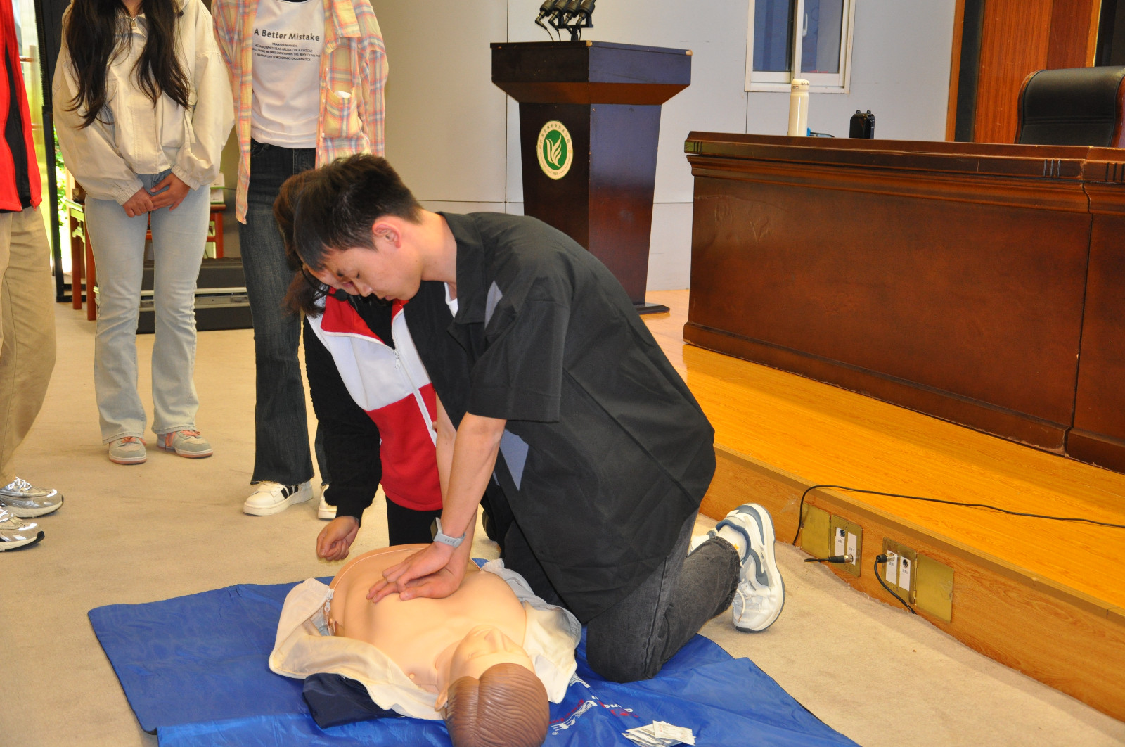 在模拟演示中,讲师使用人体模具进行心肺复苏的教学演示,并邀请部分学生代表走上台来亲手体验。“这是一课可以‘救命’的课。”大学生们表示,当天的急救培训很有必要,让大家切实掌握了应急救护的相关知识,提高了大家在意外来临时的自救互救能力。