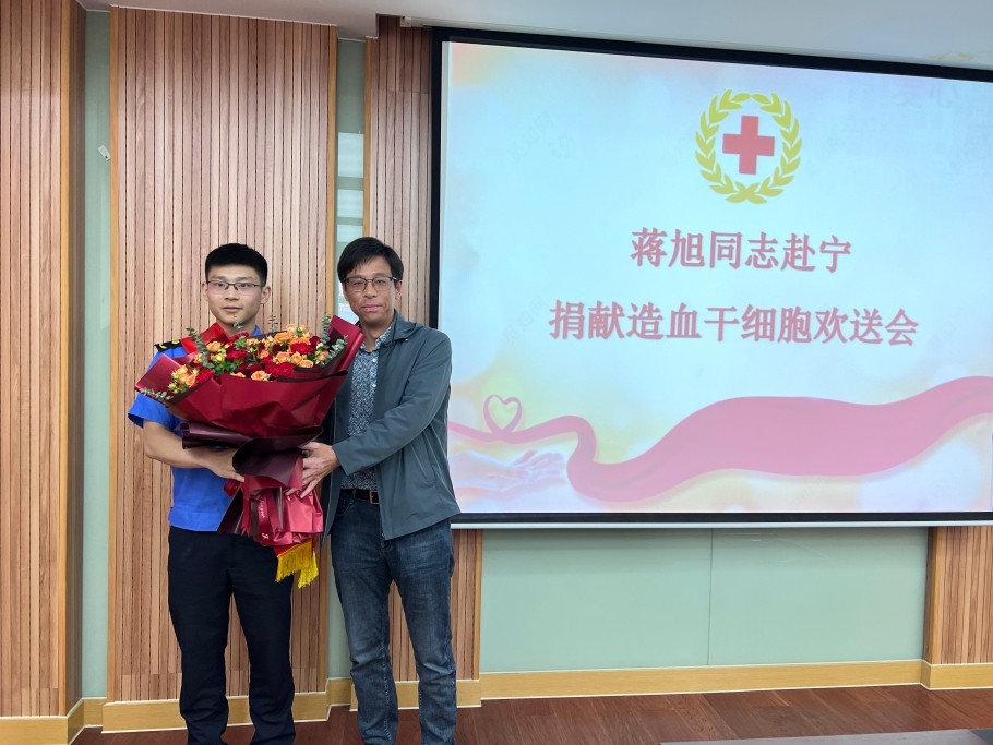 月城镇首位成功捐献造血干细胞志愿者陈虎江为蒋旭披绶带、献鲜花。大爱无疆为生命摆渡,铁肩担当传博爱精神。祝愿蒋旭赴南京捐献之行圆满成功、早日凯旋!